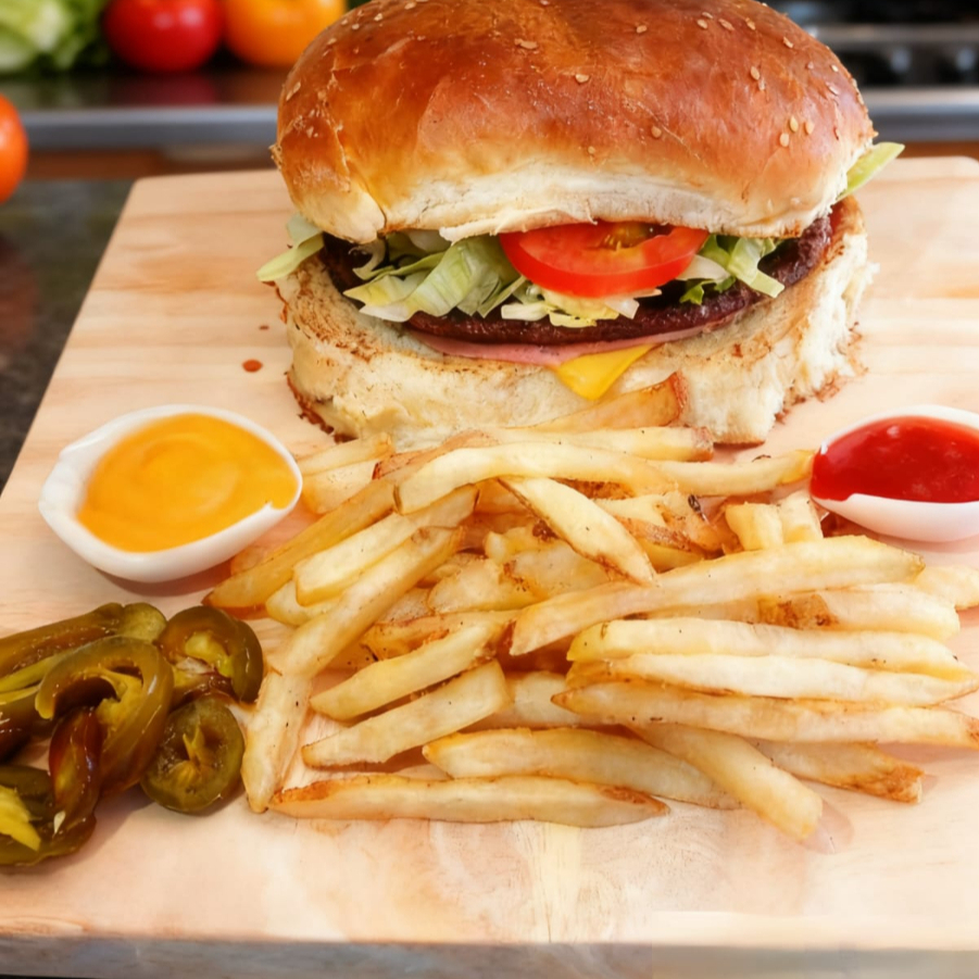 pan del dia, 2 carnes, queso amarillo, jamon, lehuga, tomate, aguacate y mayonesa. papas fritas