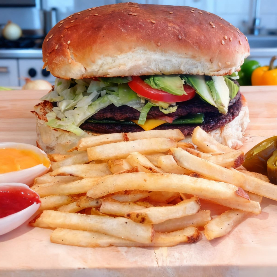 pan del dia, 2 carnes, queso amarillo, queso mozarella, chile verde, lechuga, tomate, aguacate y mayuonesa. papas fritas