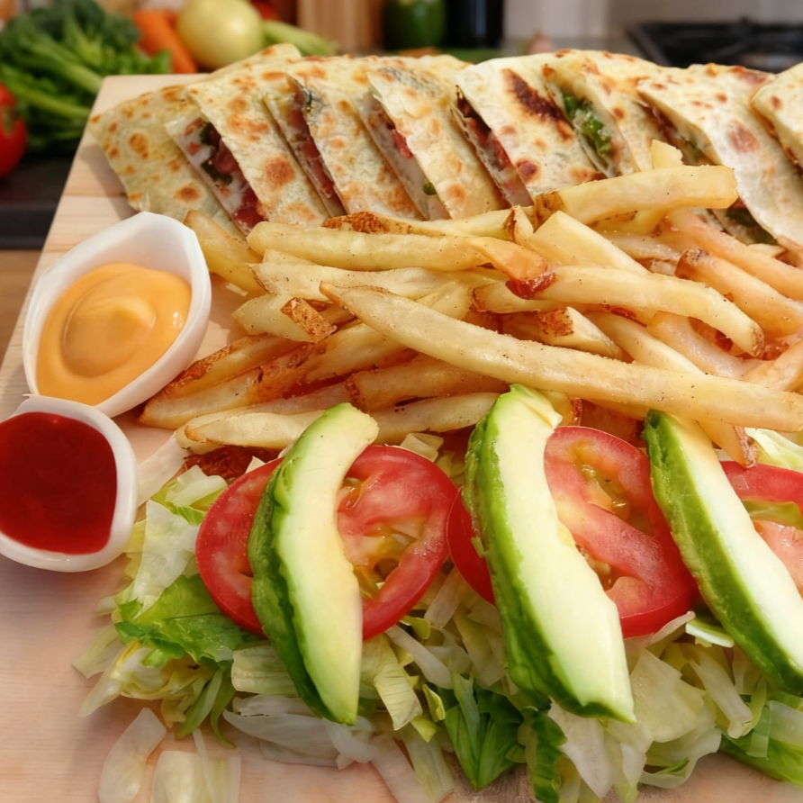 dos quesadillas queso, tocino, chile verde... lechuga, tomate y aguacate... papas fritas
