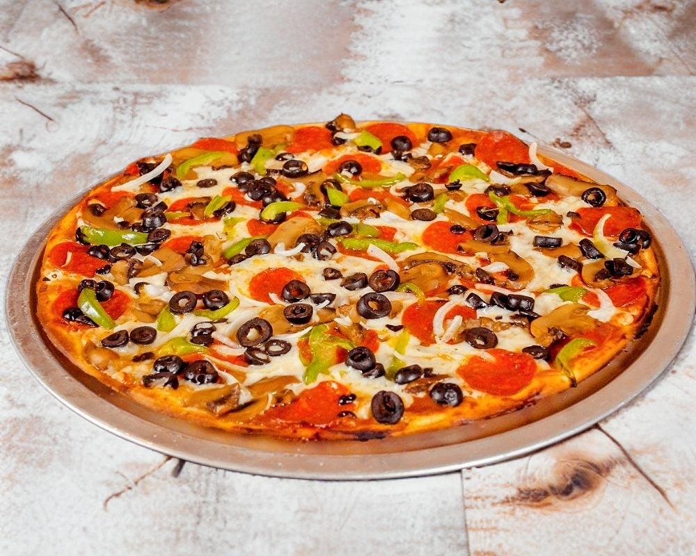 Pizza Italiana Grande 14¨ 8 Rebanadas, Ingradientes: Peperoni, champiñón, aceituna negra, pimiento verde, cebolla.