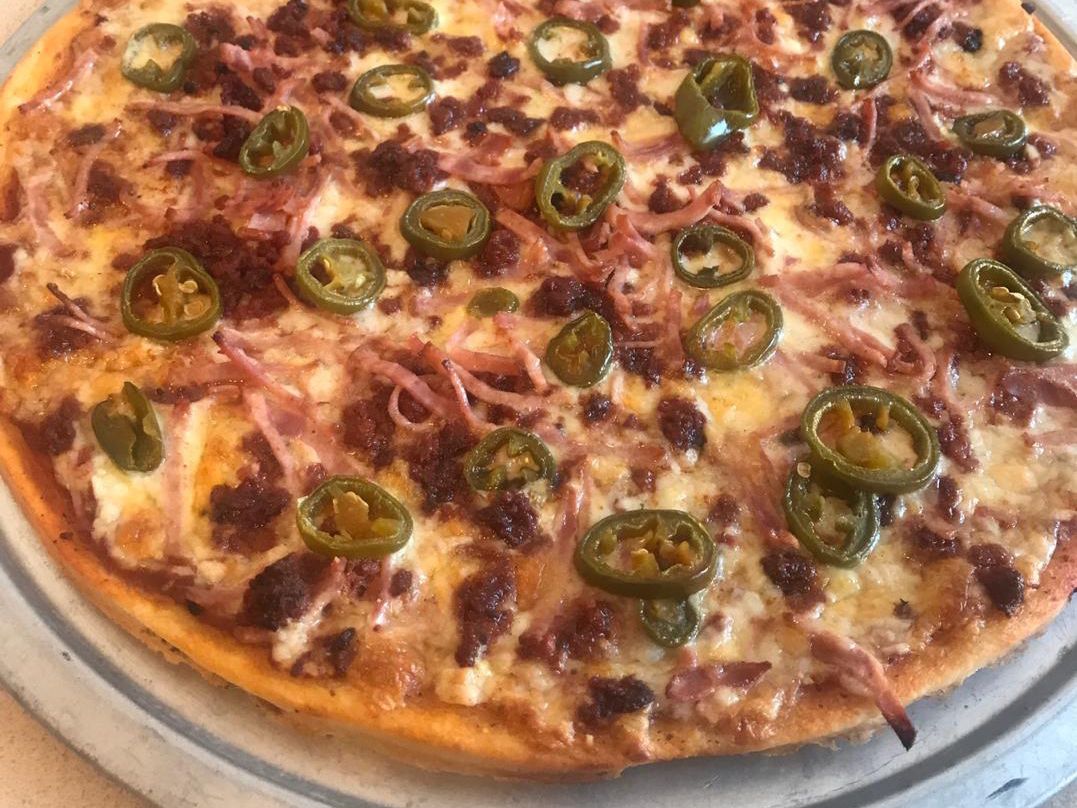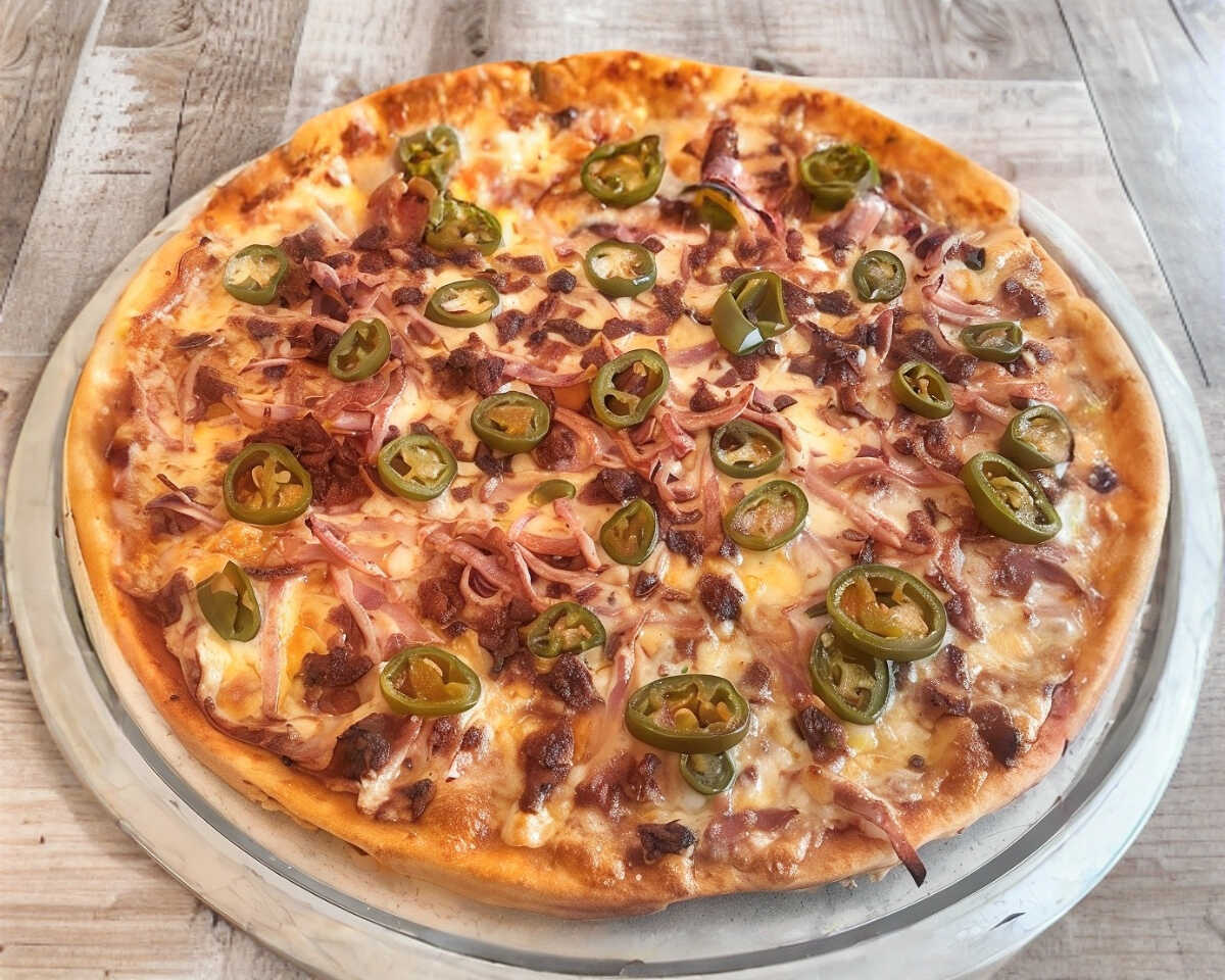 Pizza Mexicana Grande de 8 rebanadas, ingredientes: Chorizo, jalapeño, tocino.(Tamaño 35X35 )