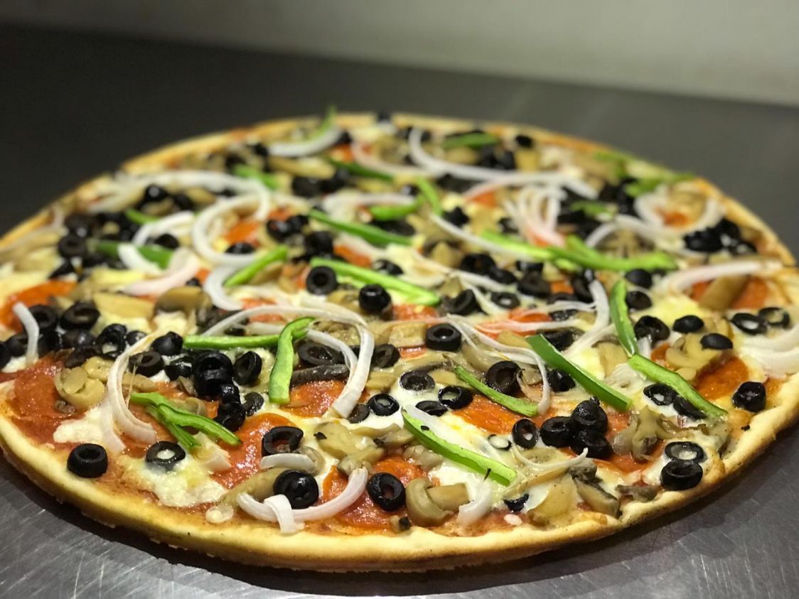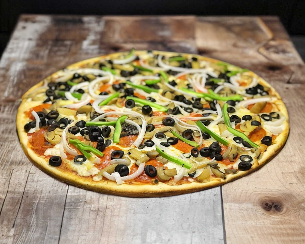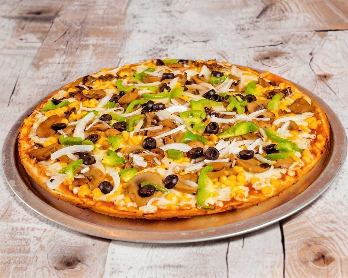 Pizza vegetariana Grande 14¨ 8 Rebanadas, Ingredientes: Champiñón, elote, aceituna negra, pimiento verde.