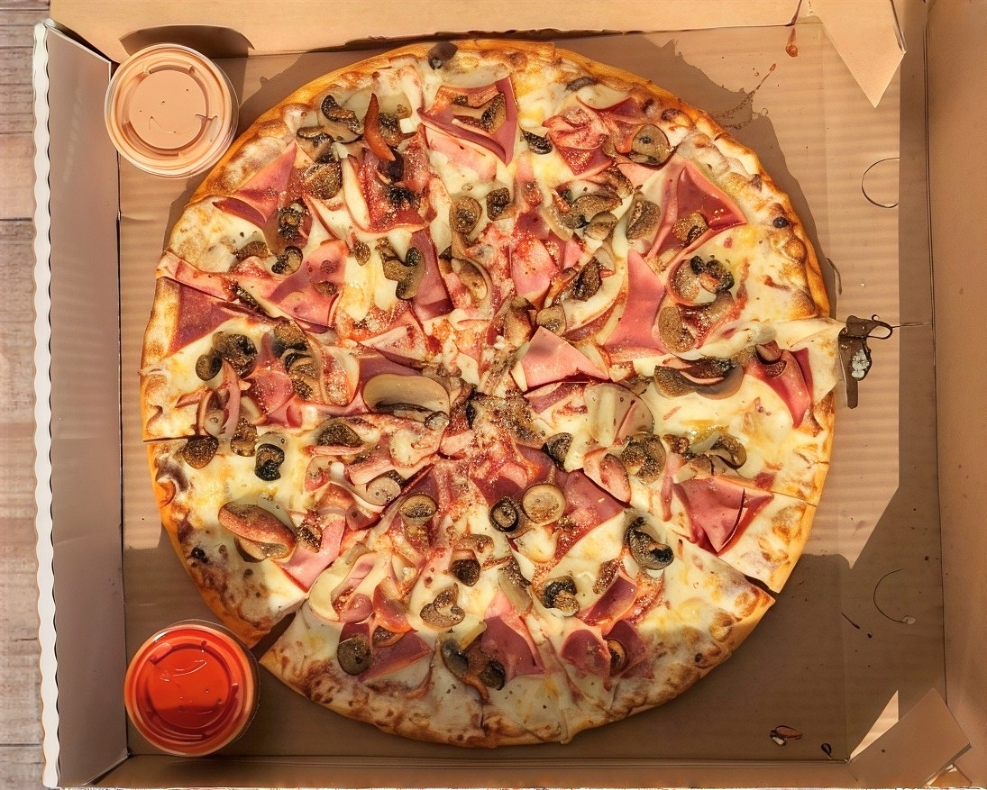 Pizza Tradicional Grande 14¨ 8 rebanadas, Ingredientes: Jamón, champiñón.