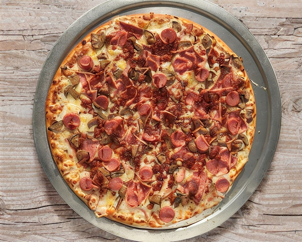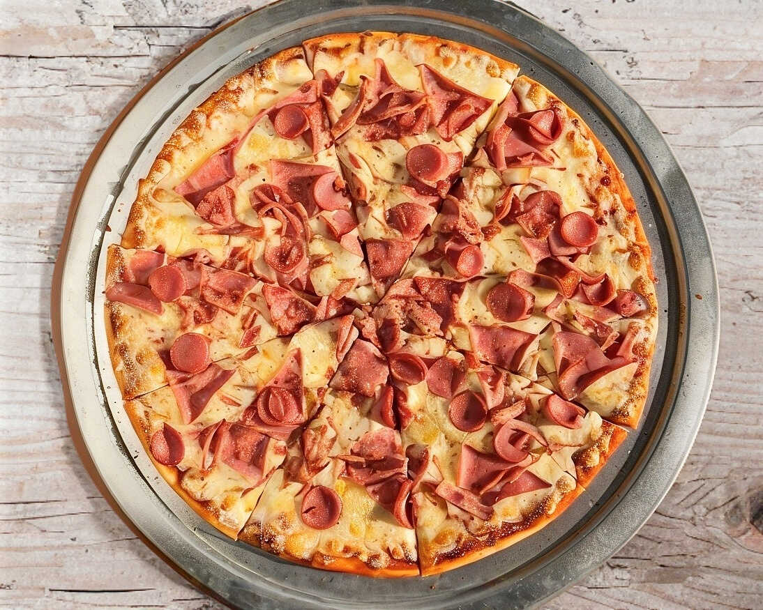 Pizza Carnes Frias Mediana, 12¨ 8 Rebanadas, Ingredientes: Jamón, salchicha, tocino.