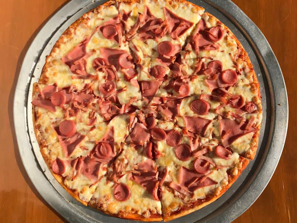 Pizza Grande 14¨ 8 Rebanadas , ingredientes Jamón, salchicha, tocino. Máximo para 3 personas