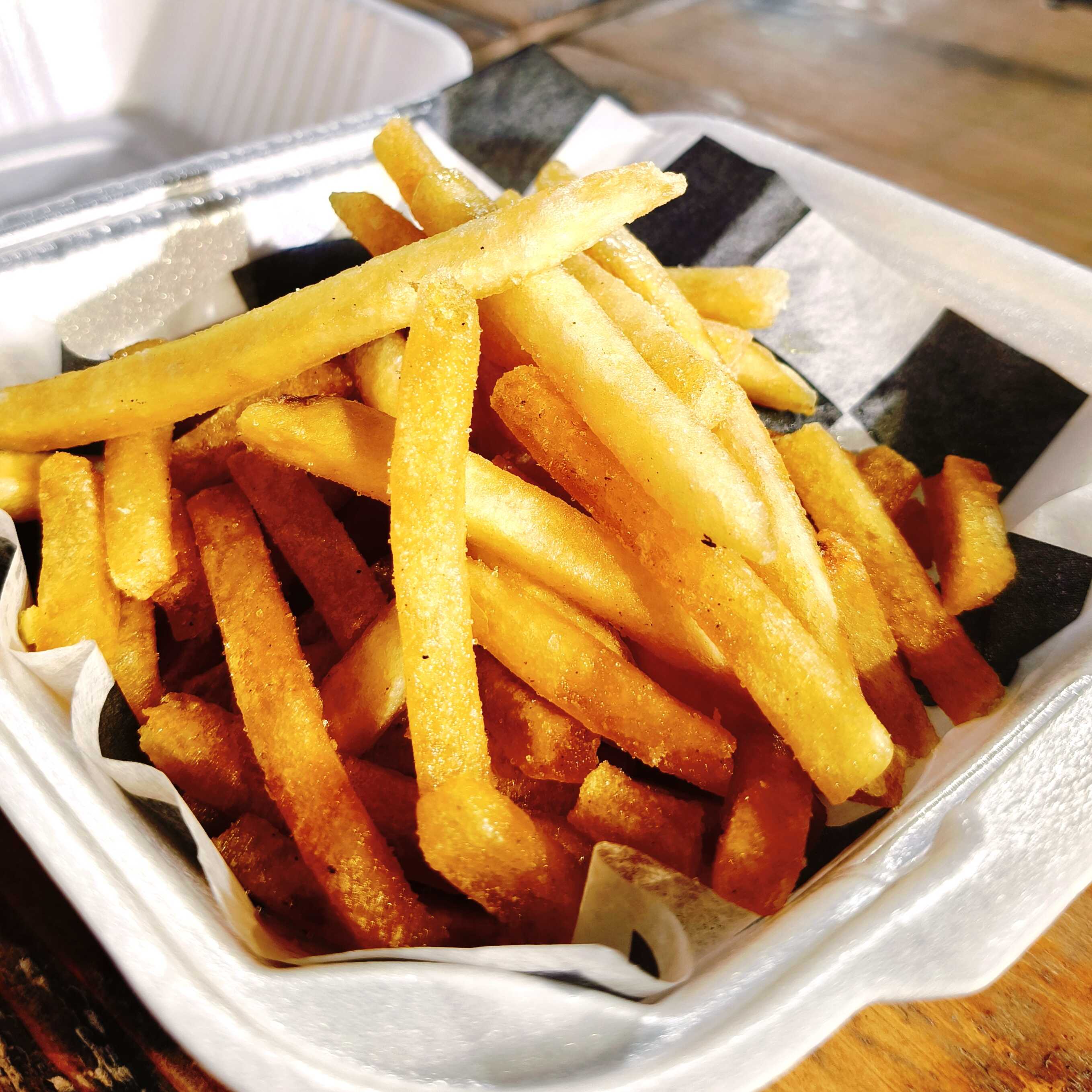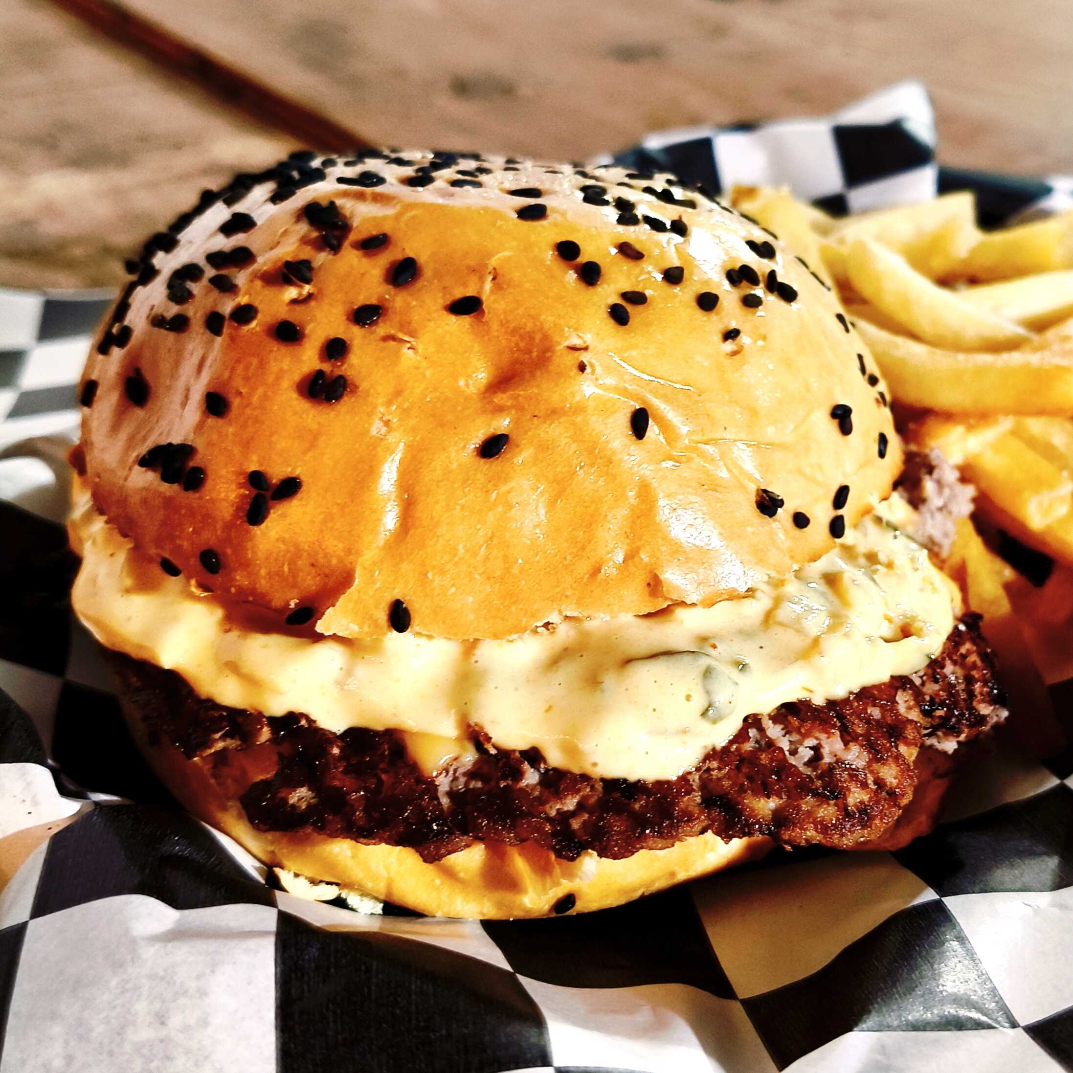 Pan brioche, carnes tipo smash de 70 gr, queso amarillo, cebolla caramelizada y aderezo de la casa. Acompañada de porción de papas a la francesa