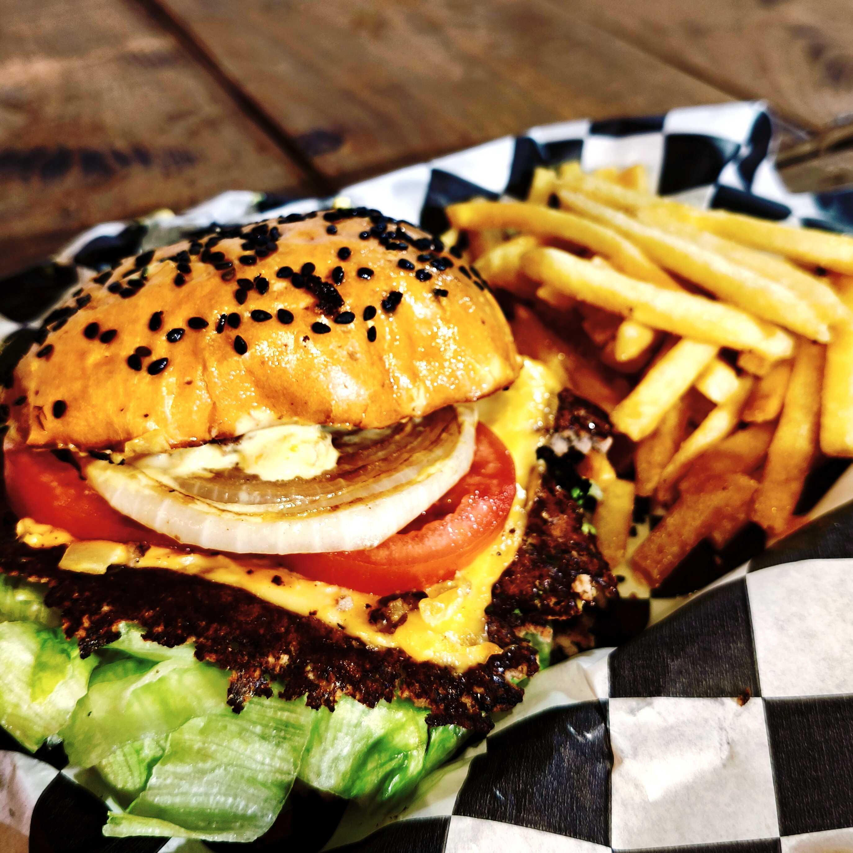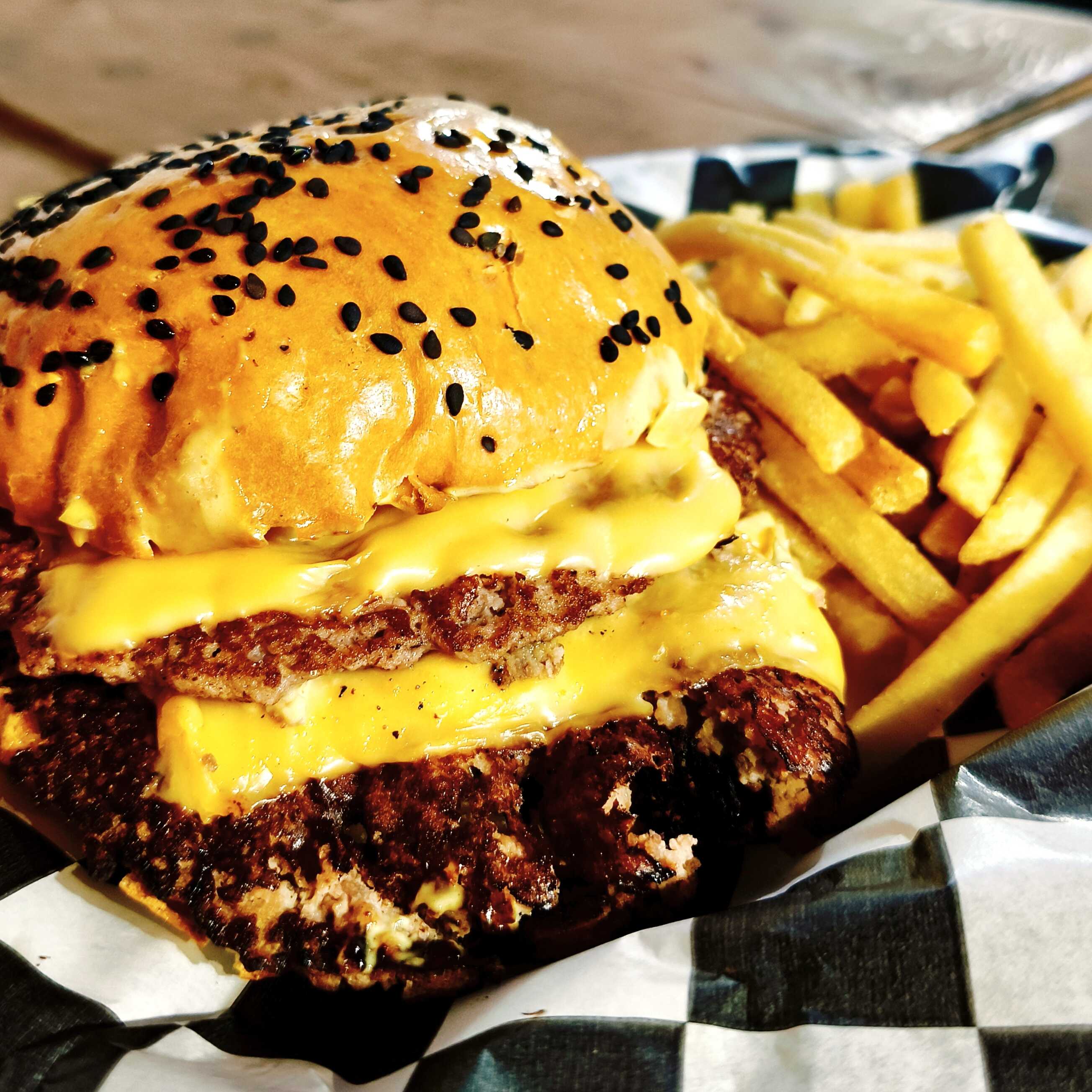 Pan brioche, dos carnes tipo smash de 70 gr cada una, queso amarillo, cebolla caramelizada y aderezo de la casa. Acompañada de porción de papas a la francesa