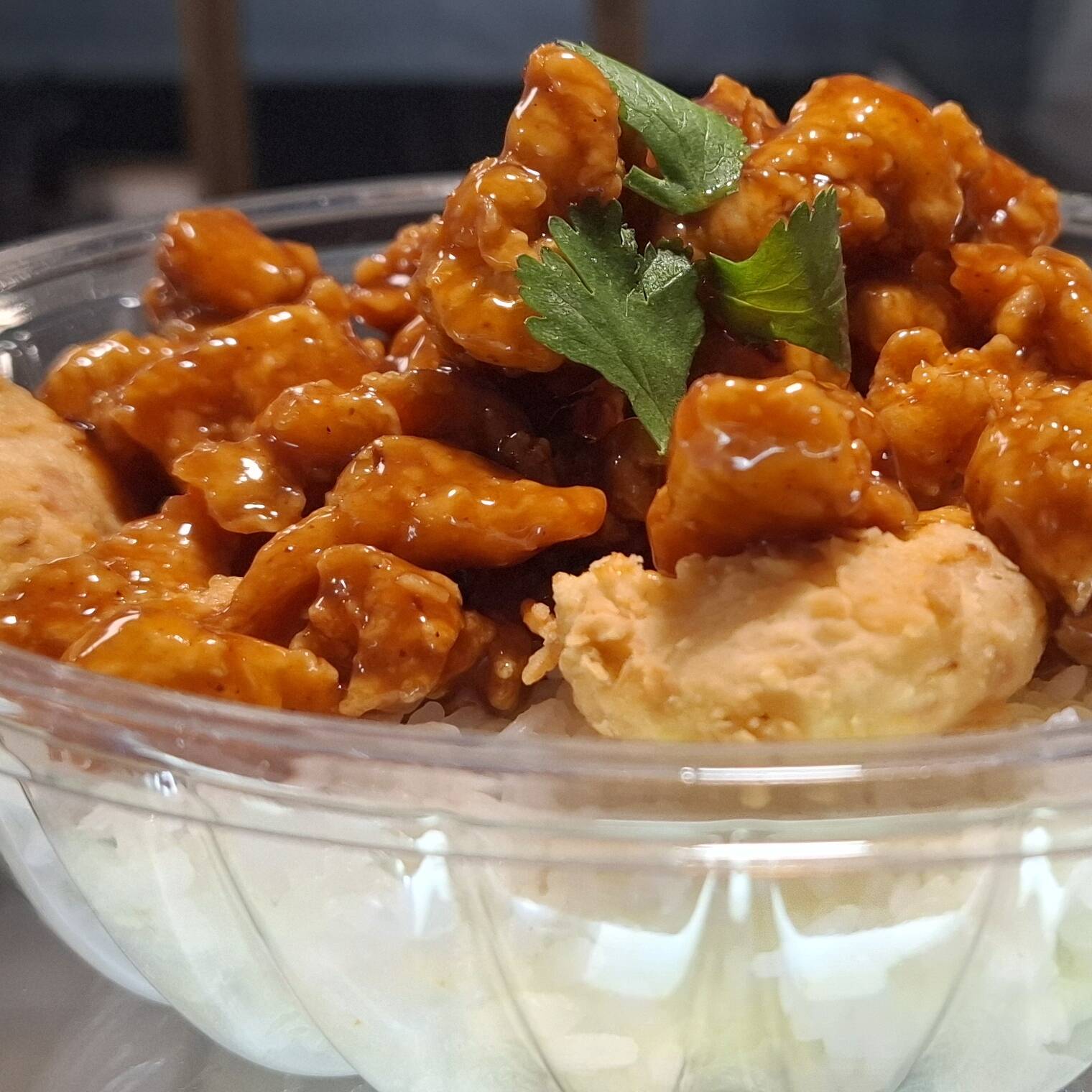 Trozos de pollo capeados y bañados en salsa de naranja. Cama de arroz. Chipotle soya y seco aparte