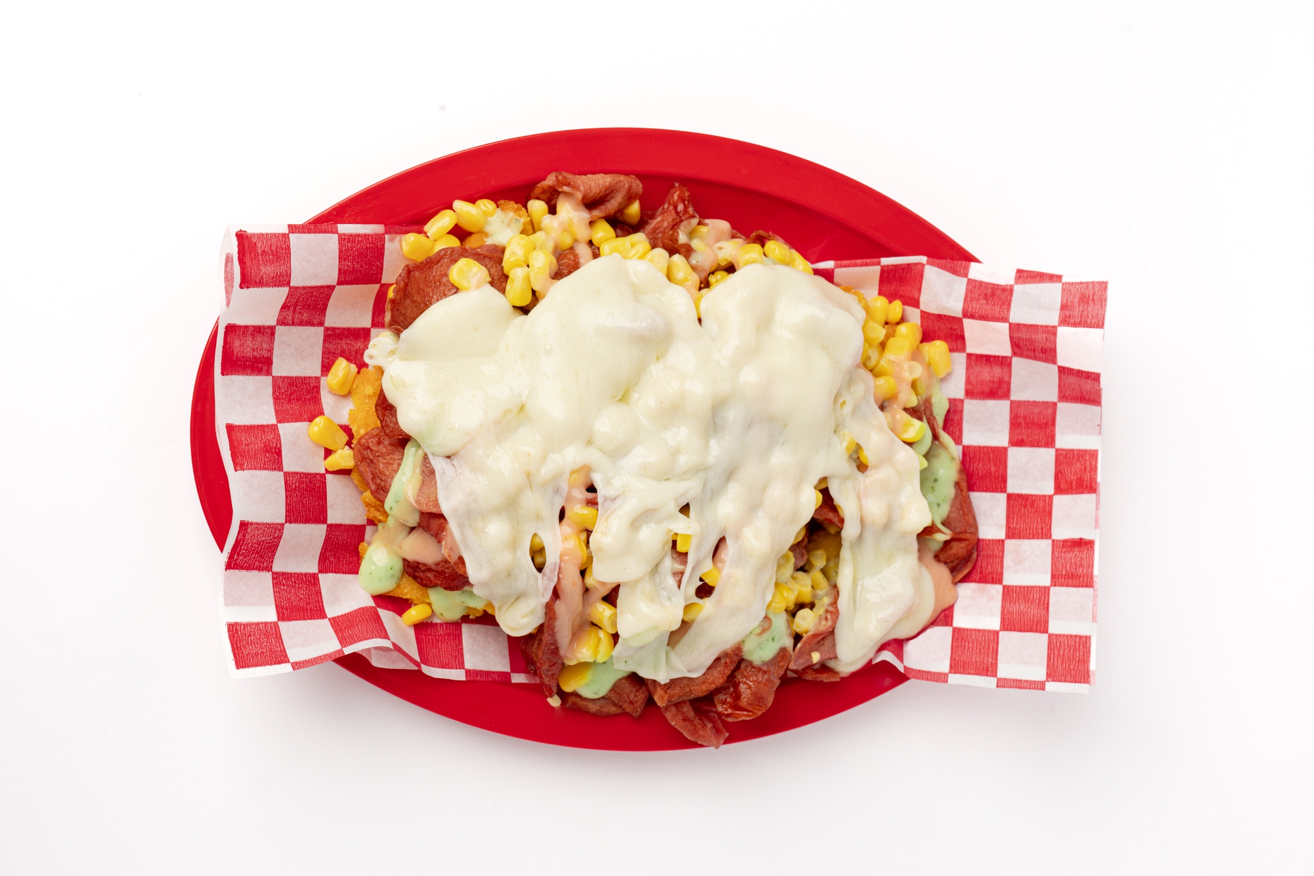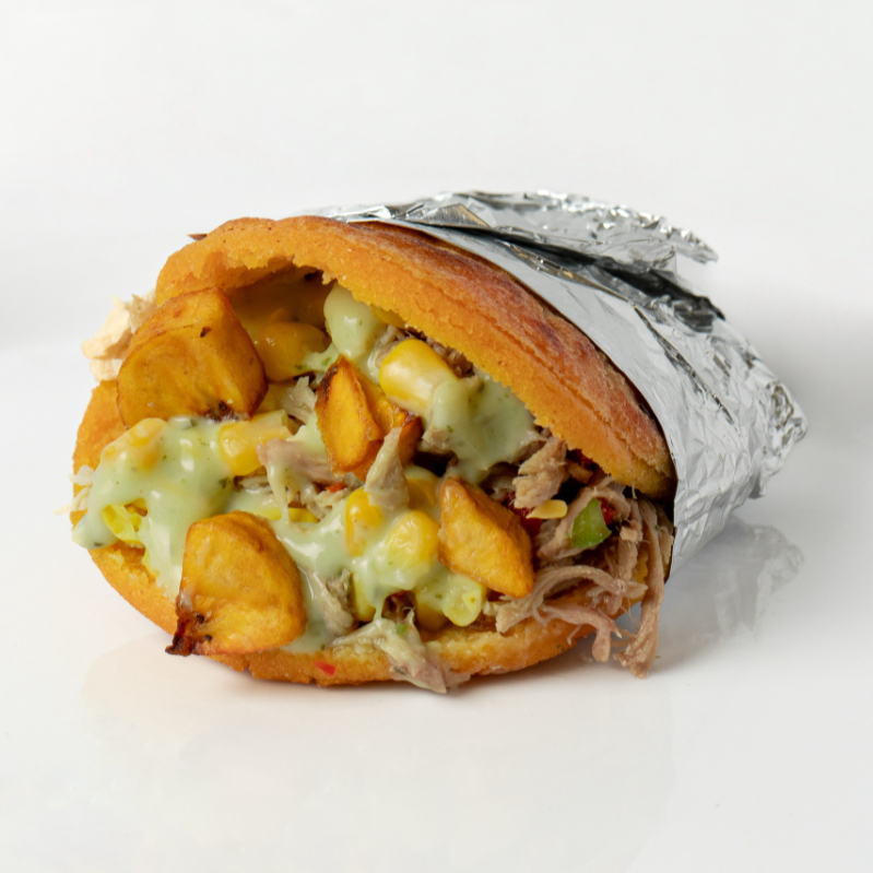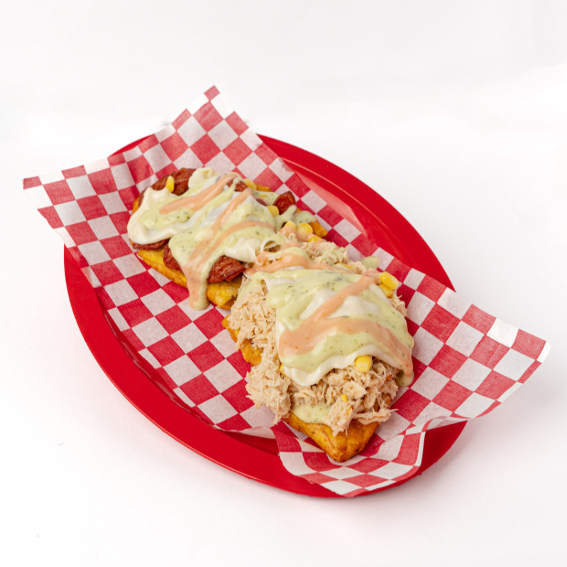 Doble orden de arepa frita picada con carne y pollo desmechado, salchicha, maicitos, maduro en trocitos, gratinado de queso mozzarella y aderezos tradicionales. 2 kilos de puro sabor colombiano, perfecta para compartir.