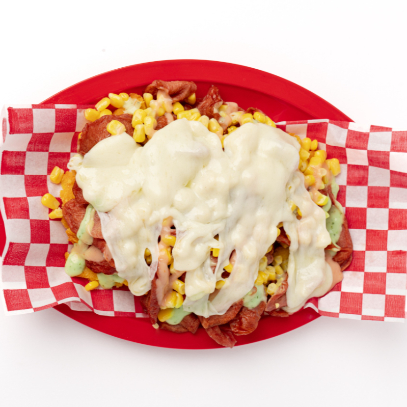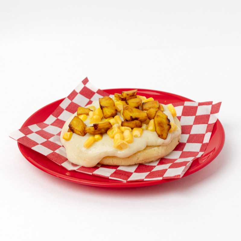 Doble arepa frita y crocante como base, cubierta con jugosa salchicha en trocitos, plátano macho frito que aporta el toque dulce perfecto, maíz tierno lleno de sabor y nuestra exclusiva salsa medellín 2000, todo coronado con queso mozzarella gratinado que la hace aún más irresistible.