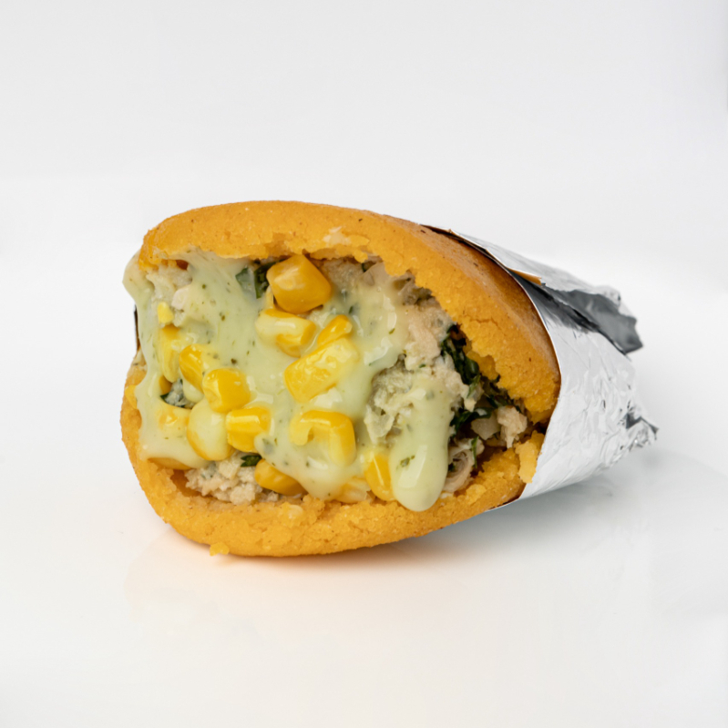 Rellena de jugosa pechuga de pollo desmechada mezclada con aguacate, cilantro, queso crema, cebolla, maicitos y aderezos tradicionales.