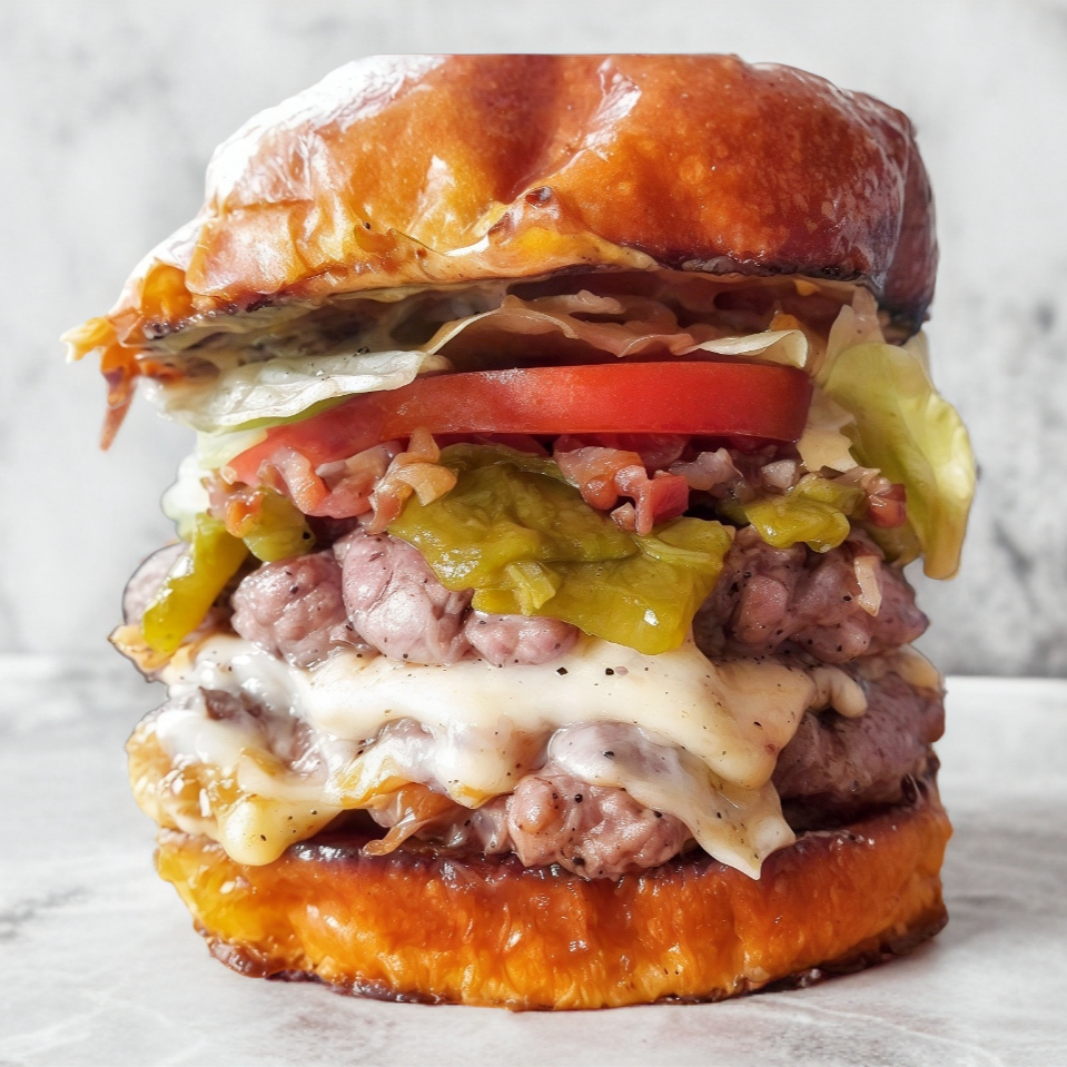 Pan brioche artesanal, carne de res receta de la casa, queso cheddar, queso mozzarella, queso philadelphia, lechuga, tomate, cebolla, aderezo y papas.