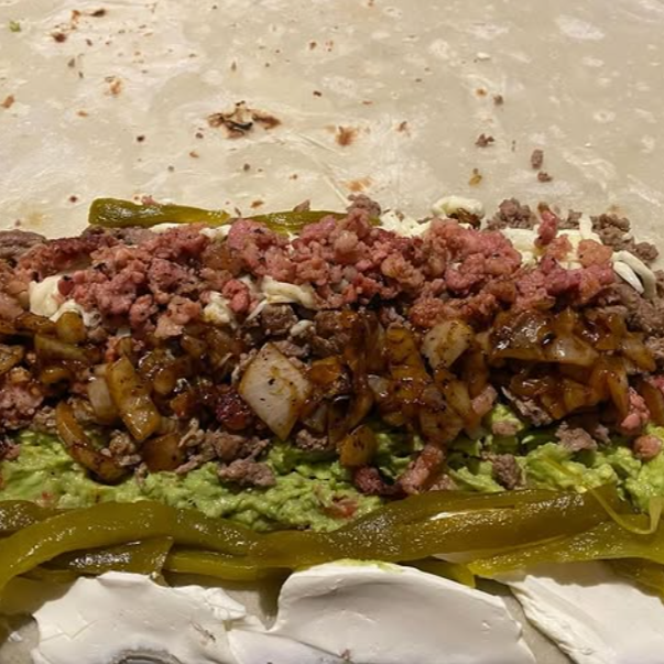 Diezmillo de res a la plancha, queso, tocino, philadelphia, chile verde, cebolla asada y wacamole especial.