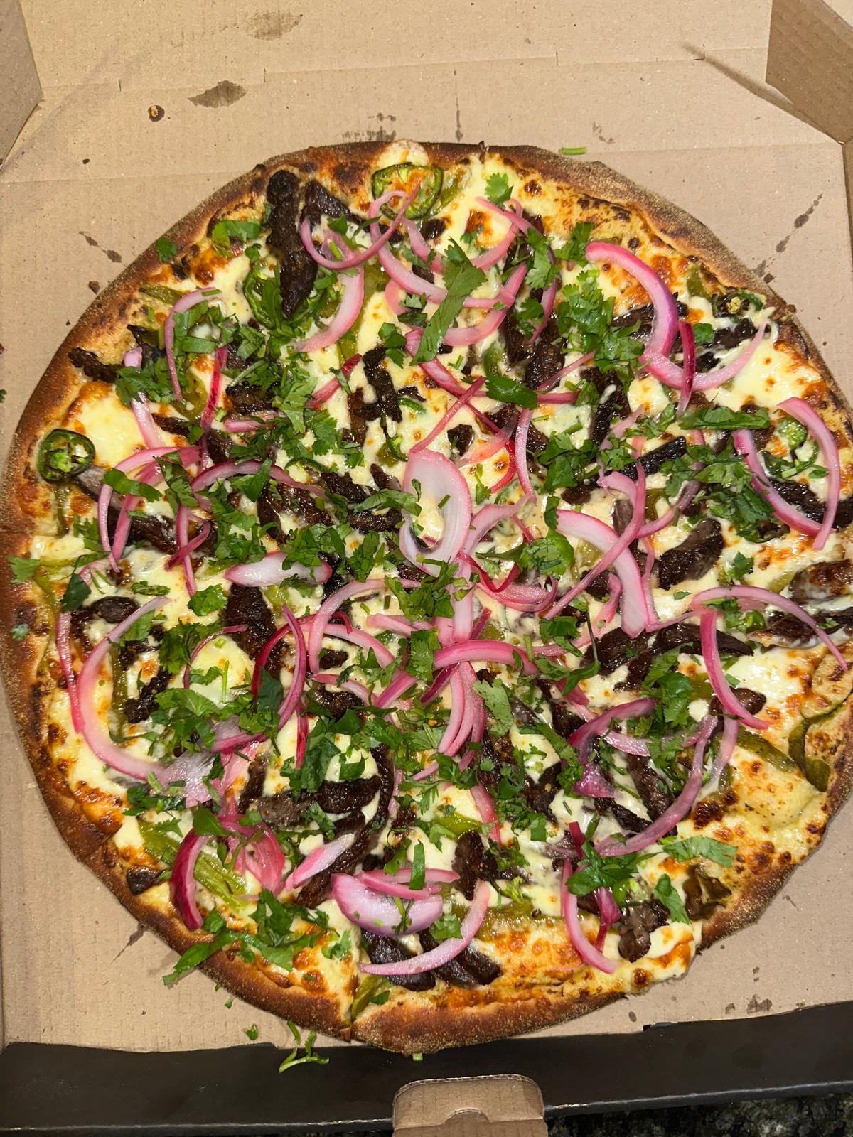 Diezmillo calidad Choice asado al carbón trozos de queso cocido Rayón 100% natural cama de crema de chile verde rajas de chile verde jalapeño cebolla morada curtida fresca y cilantro fresco.