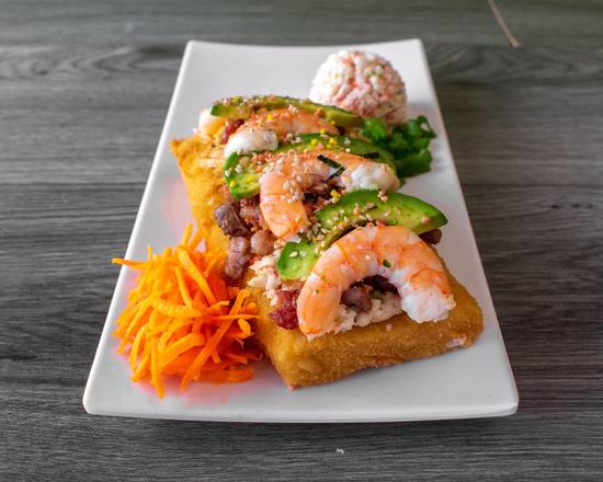Bola de arroz empanizada con 5 ingredientes a elegir, servida en cama de zanahoria, cebollín, salsa de soya y aderezo de chipotle.