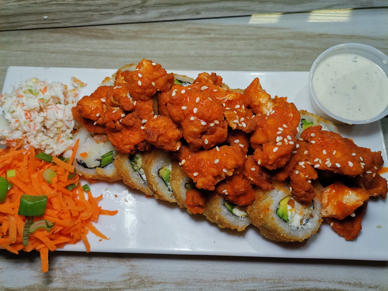Sushi a elegir con alga y porción de boneless encima con salsa de su preferencia a elegir, acompañado de orden de tampico (surimi) y aderezo de chipotle, ranch y salsa negra de la casa.