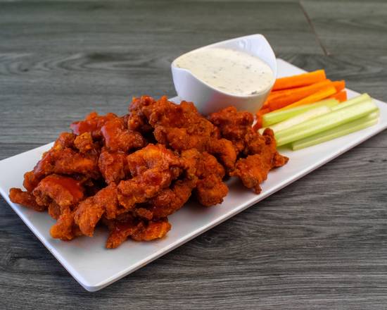 Orden mediana de tiras de pechuga sazonada y empalizadas con salsa búfalo o BBQ, ranch, con baritas de apio y zanahoria.