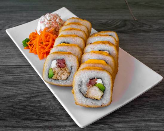Philadelphia, aguacate, alga, camarón, tocino por dentro y queso gratinado por fuera.