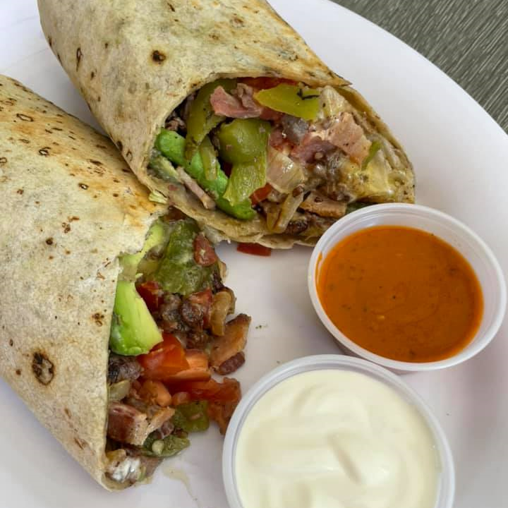 Burrito con carne de res deshebrada y frijoles, pico de gallo, salsa roja, repollo, salsa habanera, cilantro