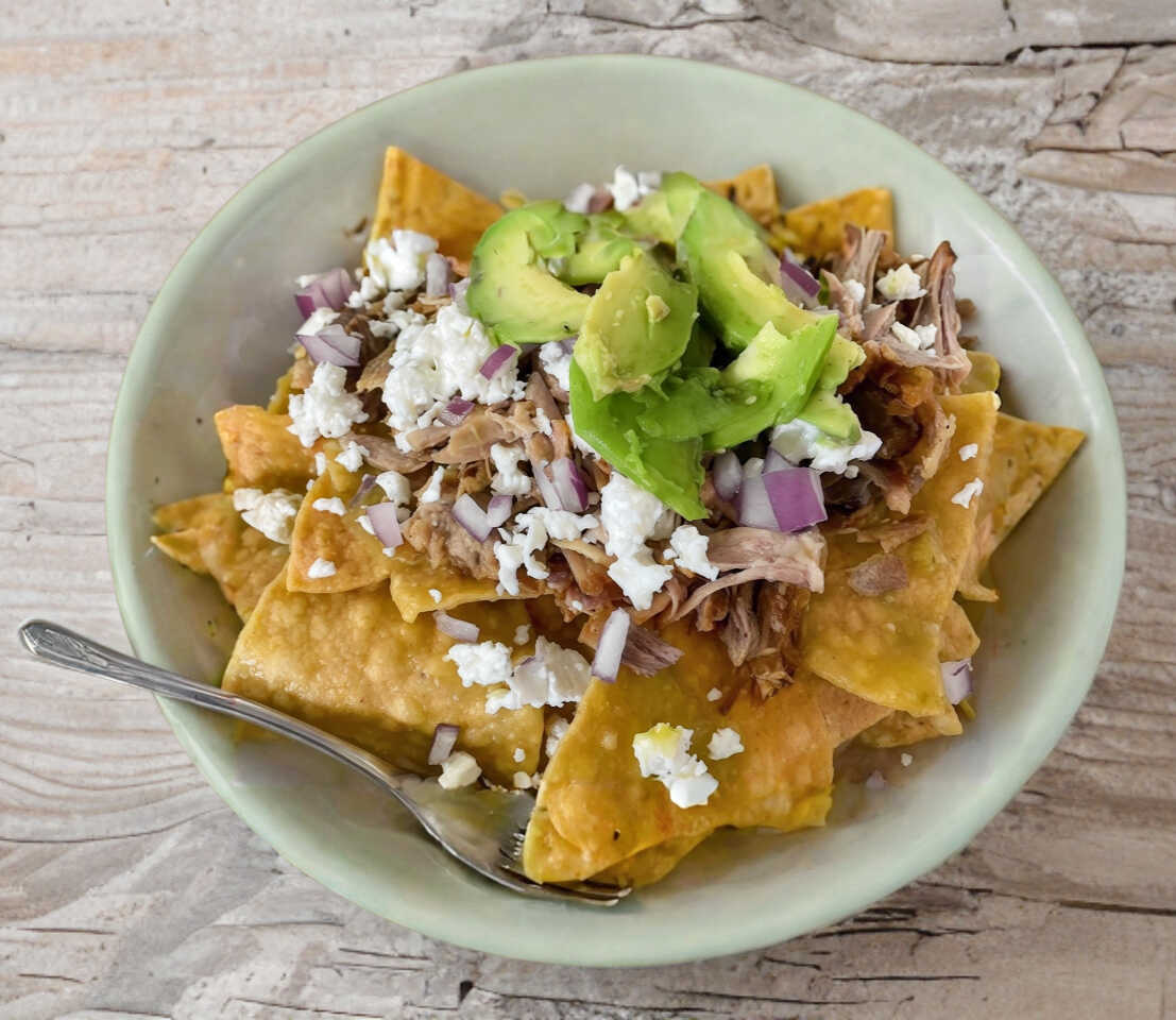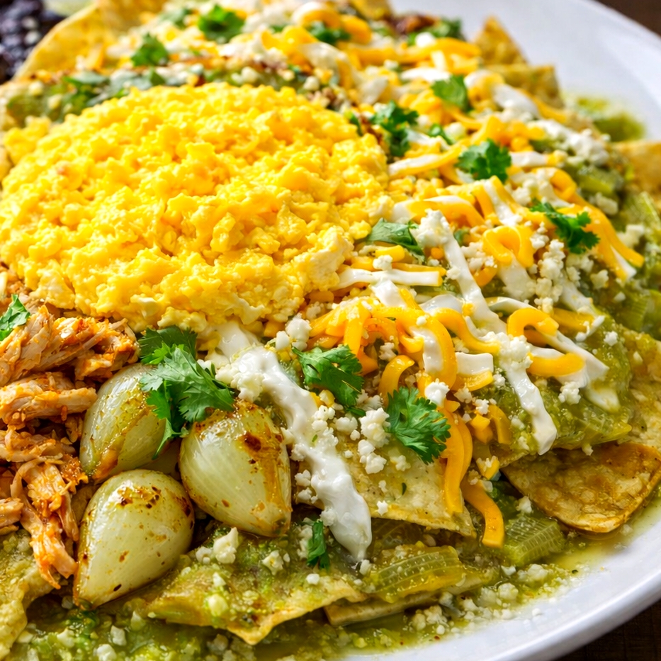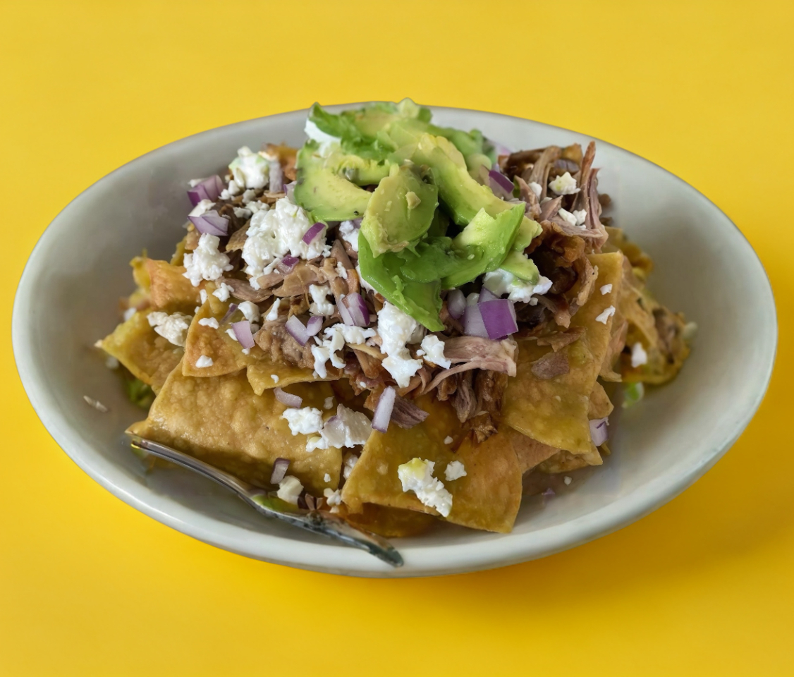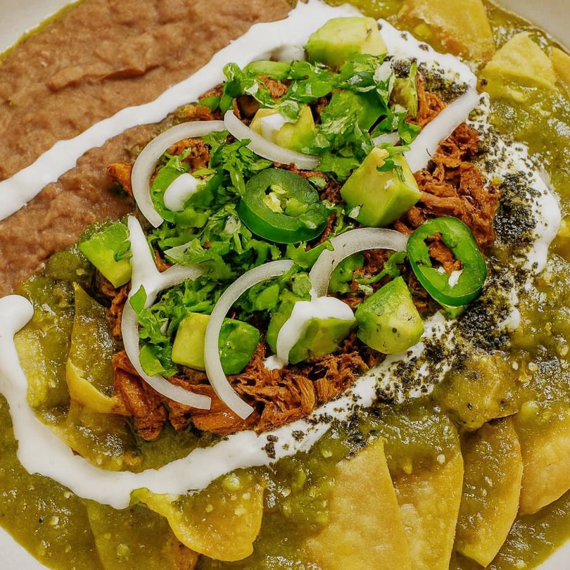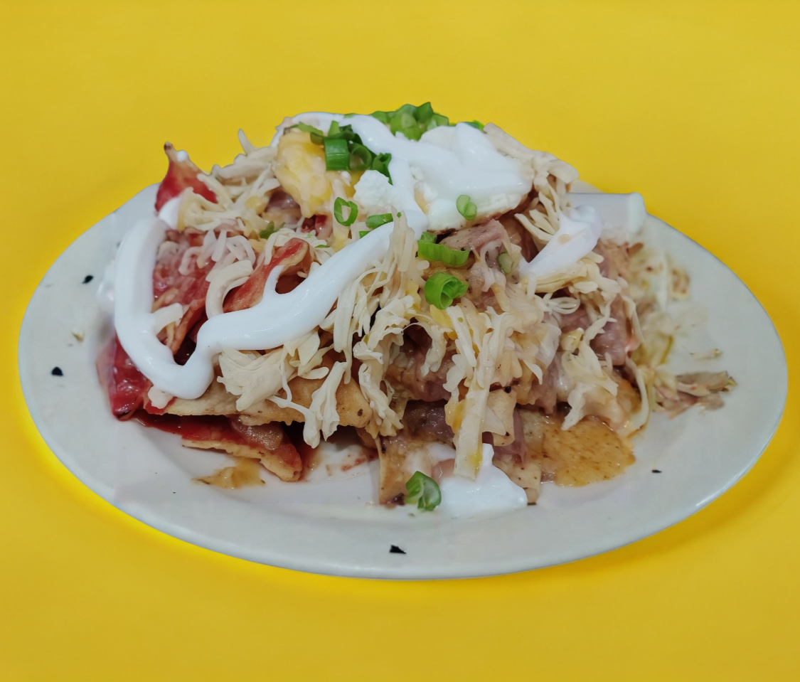 Totopos bañados en salsa verde, roja o picosa, acompañados de chicharrón que se derrite entre el queso regional y la mezcla de quesos. Terminados con crema, cebolla, cilantro y aguacate fresco. Acompañados con frijoles de la casa 🔥 El contraste perfecto entre lo suave, lo crujiente y lo sabroso.