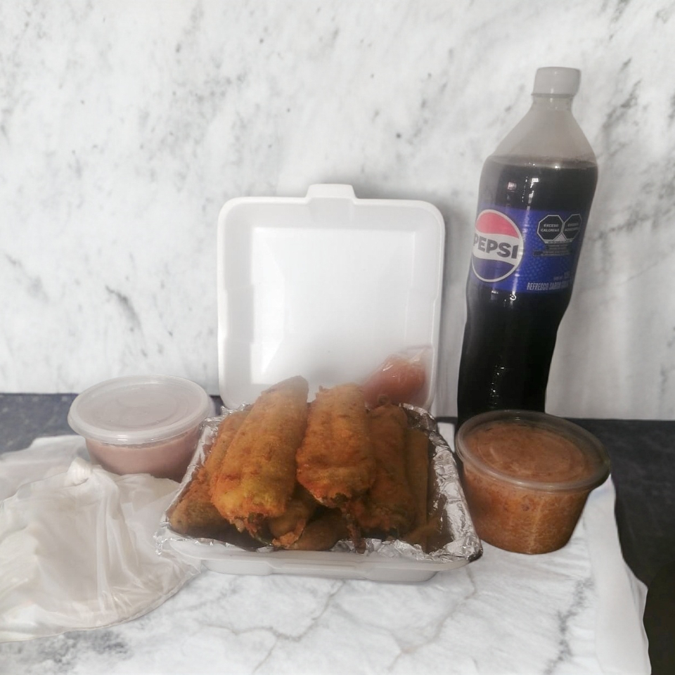 Chiles Rellenos Empanizados*1 + Frijoles*1 + Tortillas*1 + Refresco 1.5L*1 + Guarnición*1