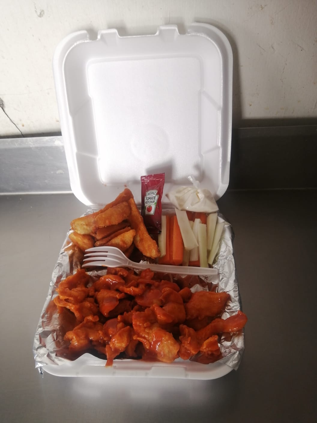 Boneless bañados en tu salsa de elección BBQ y Bufalo. Acompañados de una porción de papas, Aderezo Ranch, tiras de apio y tiras de zanahoria.
