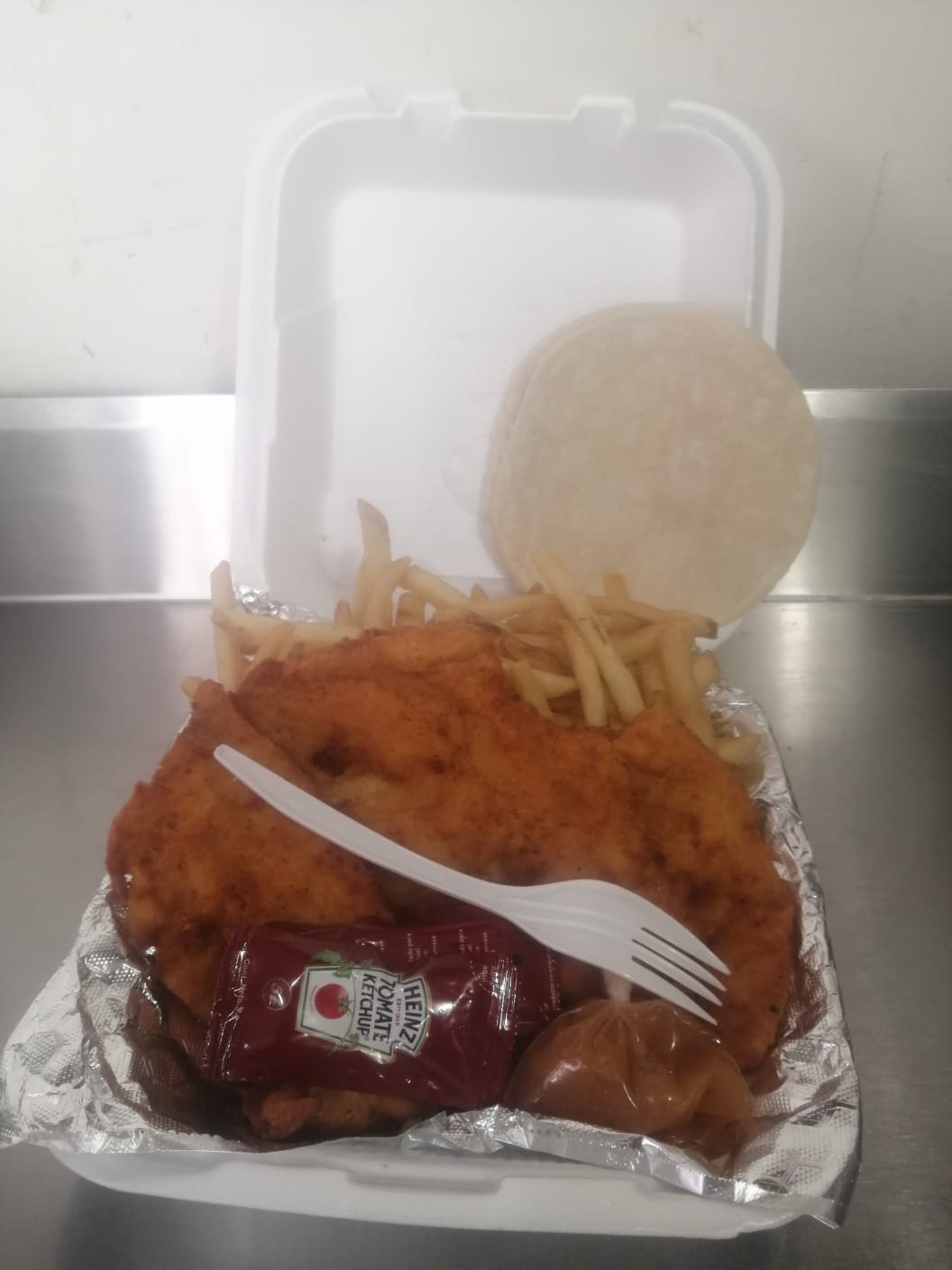 Pescado empanizado (medio kilo), tortillas y guarnición a escoger.