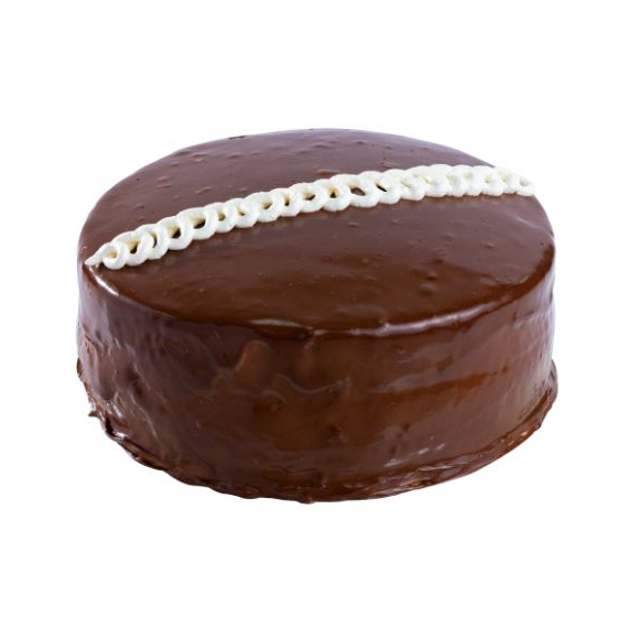 Pan de chocolate, relleno con crema de vainilla y cubierto con ganache de chocolate. Decorado con un espiral de crema de vainilla.