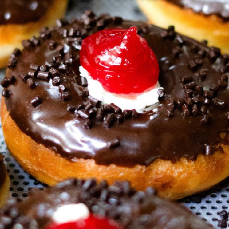 Dona cubierta de chocolate con mermelada de fresa y con granillo de chocolate.