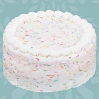 Esponjoso pan de vainilla horneado con chispas de colores, relleno de betún de azúcar con chispas y mermelada de fresa, cubierto y decorado con betún y chispas ce colores.