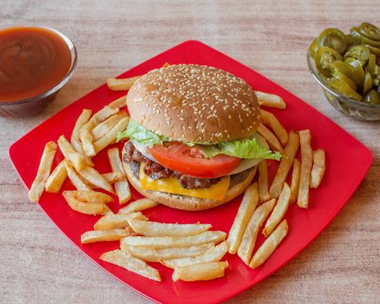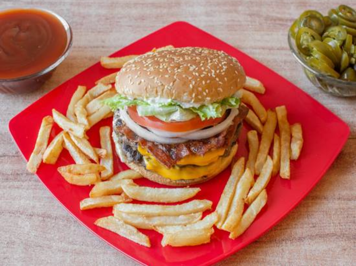 Dos carnes, queso amarillo, tocino, lechuga, tomate, cebolla y papas.