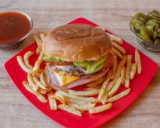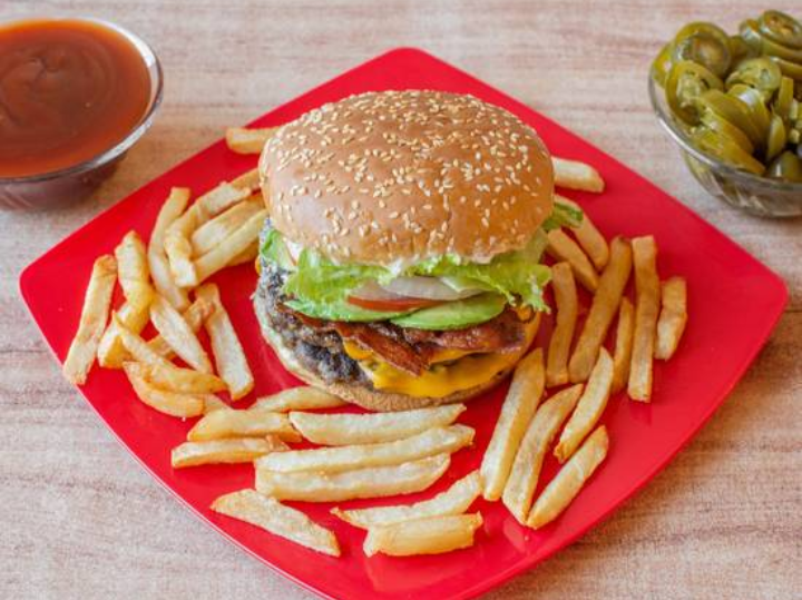 Dos carnes, queso amarillo, tocino, aguacate, lechuga, tomate, cebolla y papas.