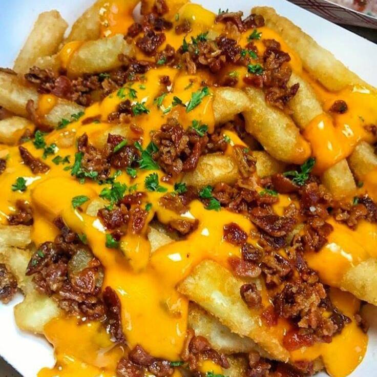 250gr. De papas a la francesa, bañadas en queso cheddar y acompañadas con tocino