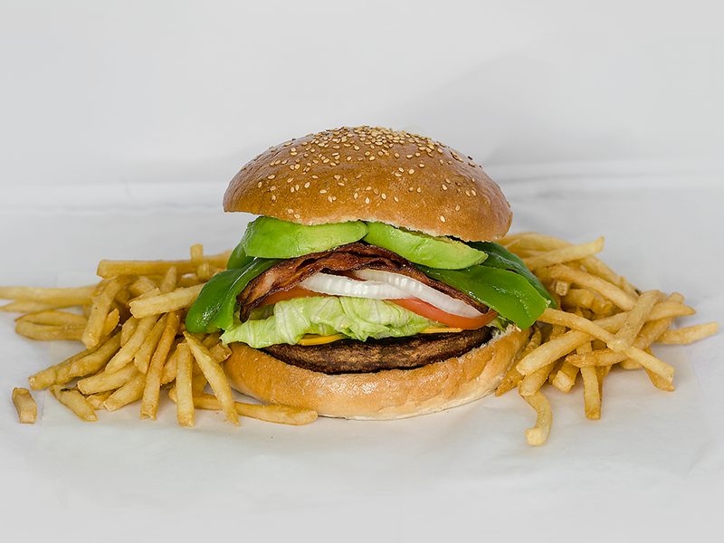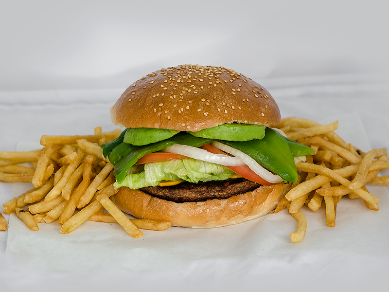 Hamburguesa de carne de res artesanal con queso amarillo, chile verde, aguacate, lechuga, tomate, cebolla, cátsup, mostaza, mayonesa, chile jalapeño, pepinillos y papas a la francesa.