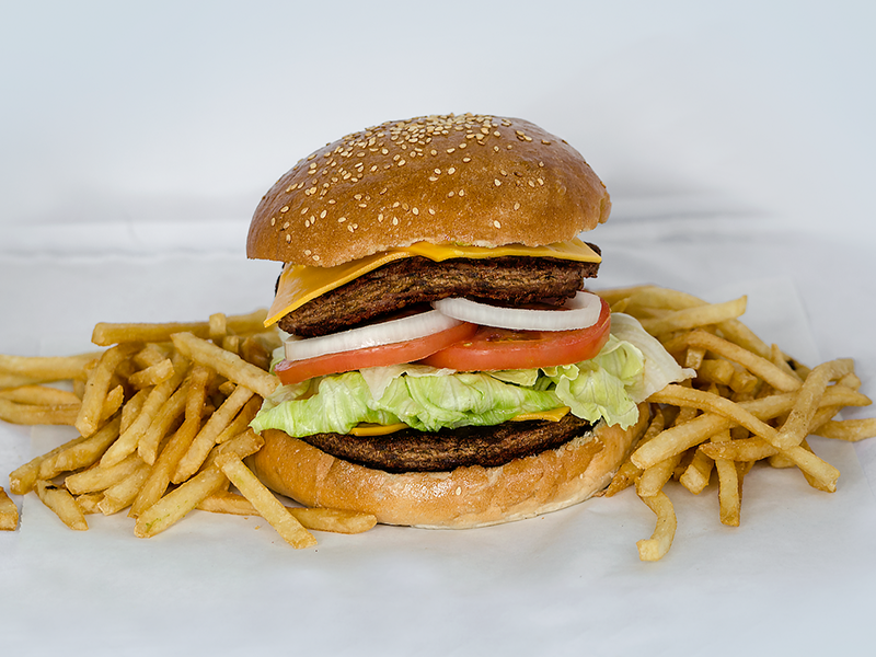 Hamburguesa con doble carne y queso amarillo incluye papas, lechuga, tomate, cebolla, catsup y mostaza