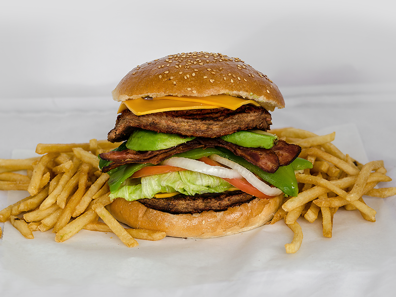 Hamburguesa con doble carne, tocino, chile verde, aguacate e incluye papas, lechuga, tomate, cebolla, catsup, mostaza y queso amarillo