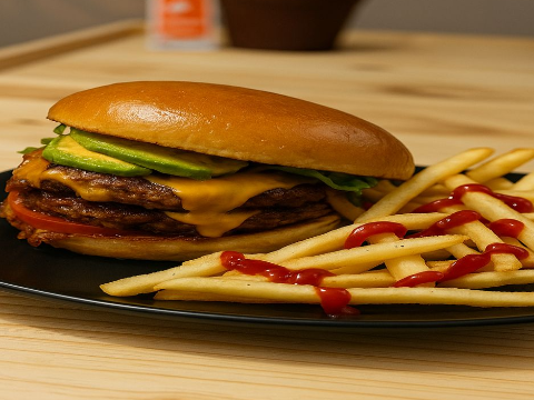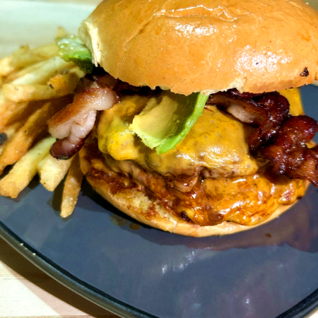 carne de res, tocino, queso, lechuga, tomate, aguacate y papas.