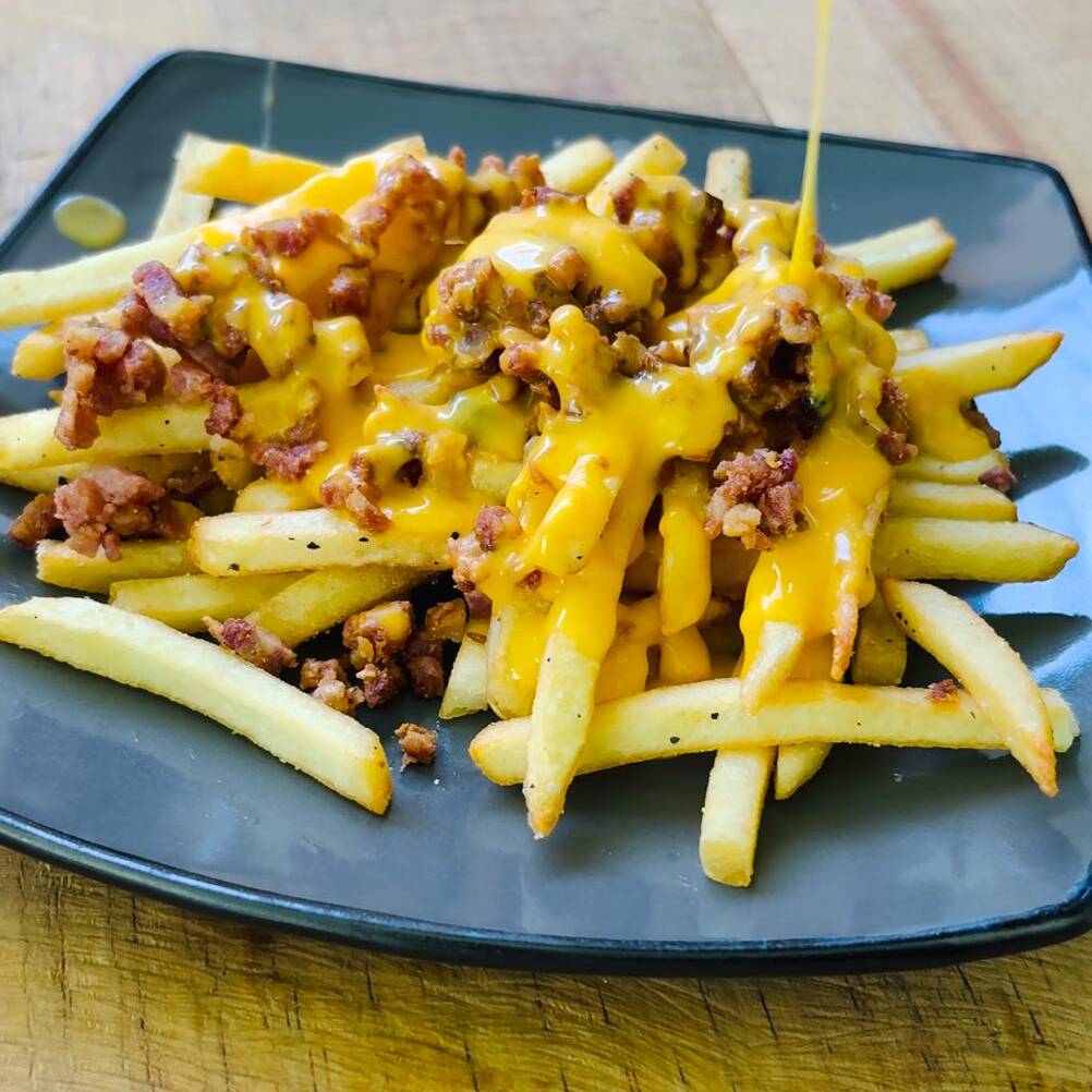 carne de res, tocino, champiñones, cebolla asada, queso chihuahua y papas.