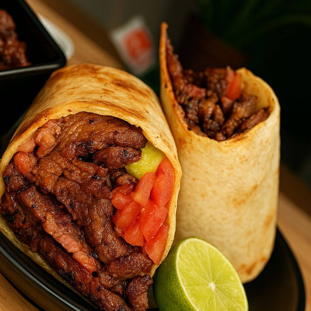 Carne de res, adobada, tocino enrollado, aguacate, tomate, queso y chile verde.
