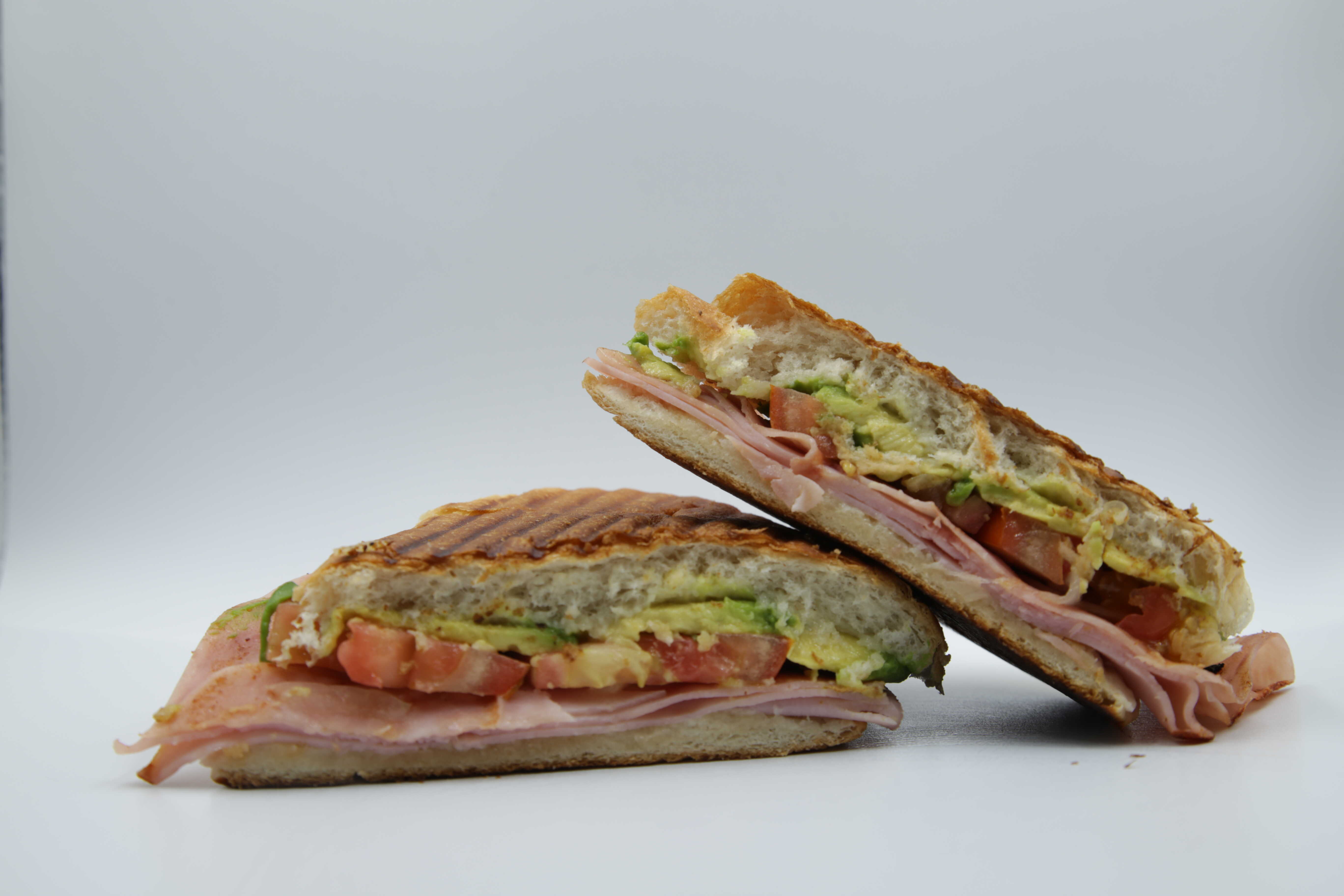 Pan telera, aguacate, tomate, cebolla, jamón, tocino y lechuga.