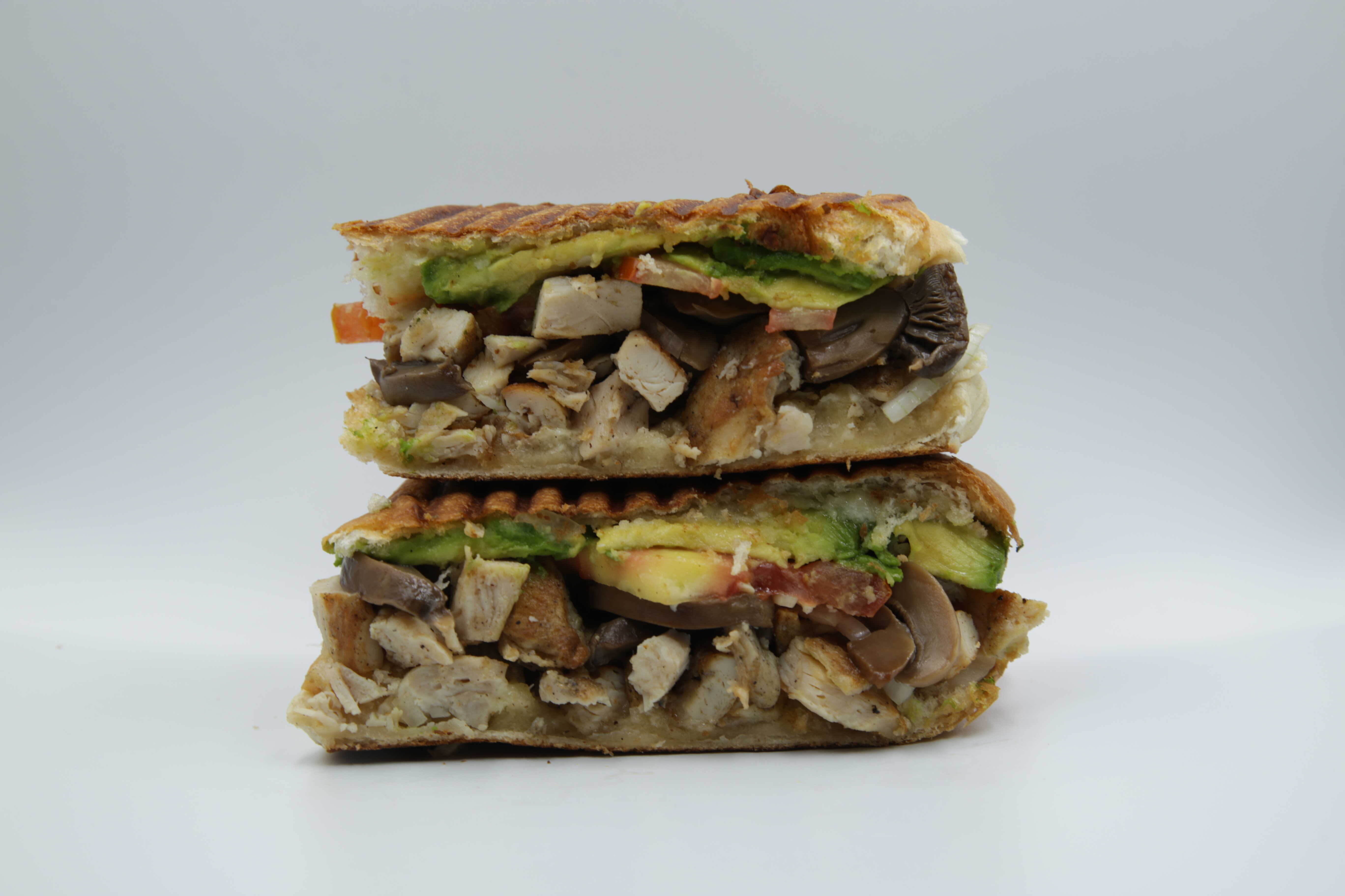 Pan telera, aguacate, tomate, cebolla, pollo y champiñones.