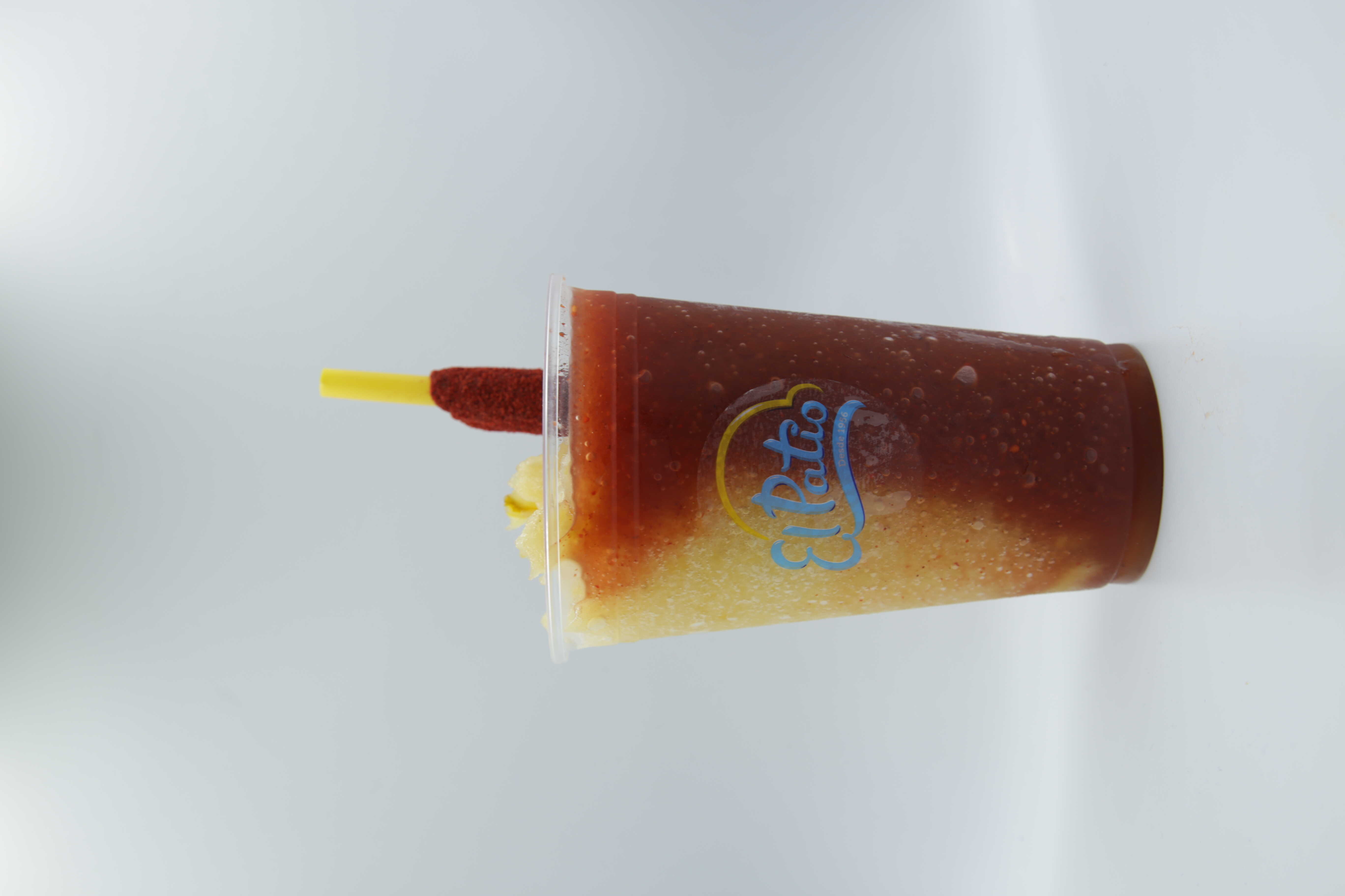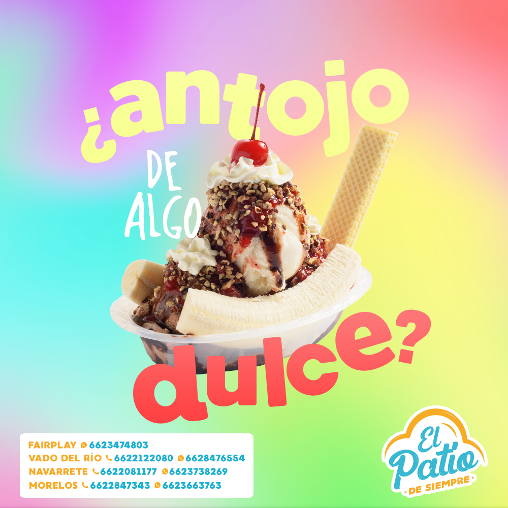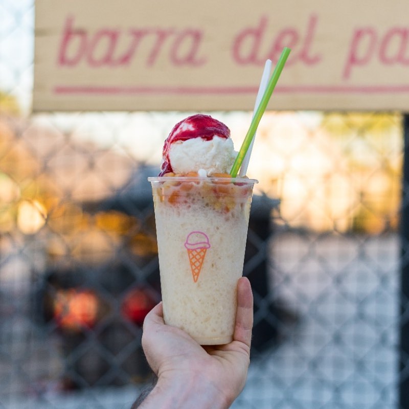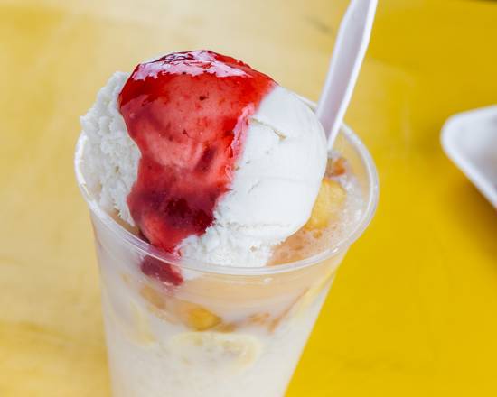 Piña con plátano, trozos de piña, coco, nieve de vainilla y una cereza.