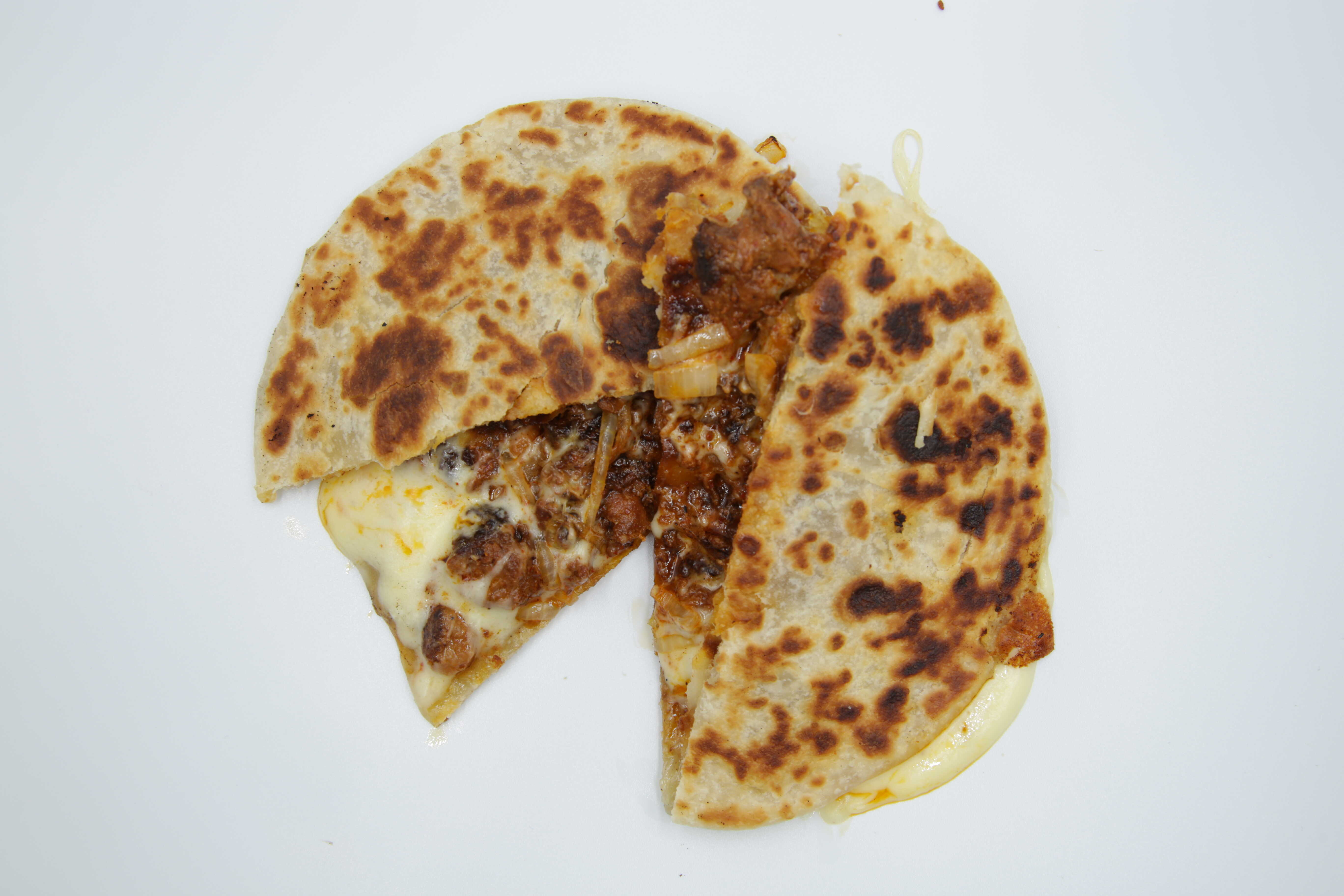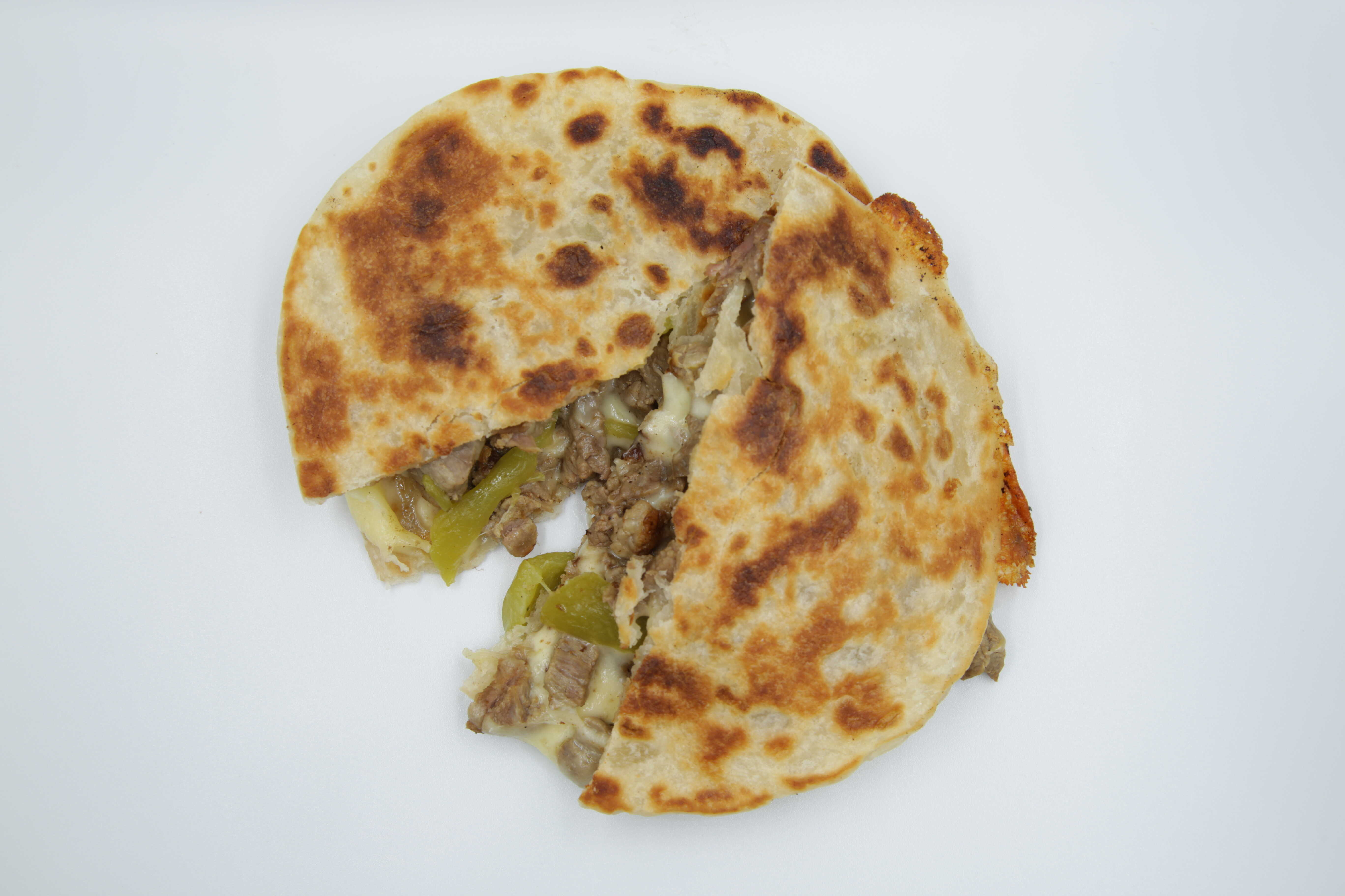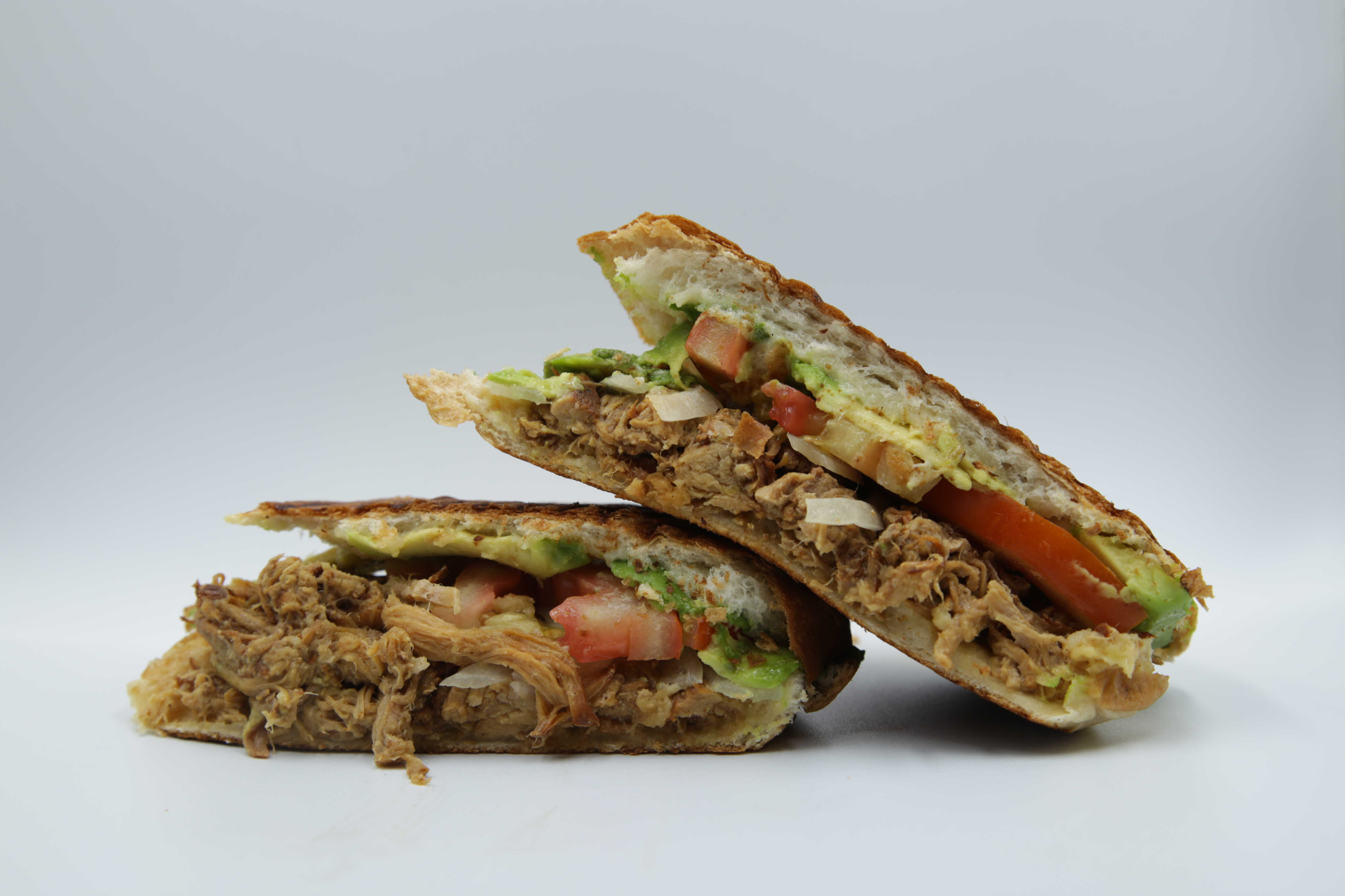 Pan telera, aguacate, tomate, cebollita asada, carne adobada y queso.