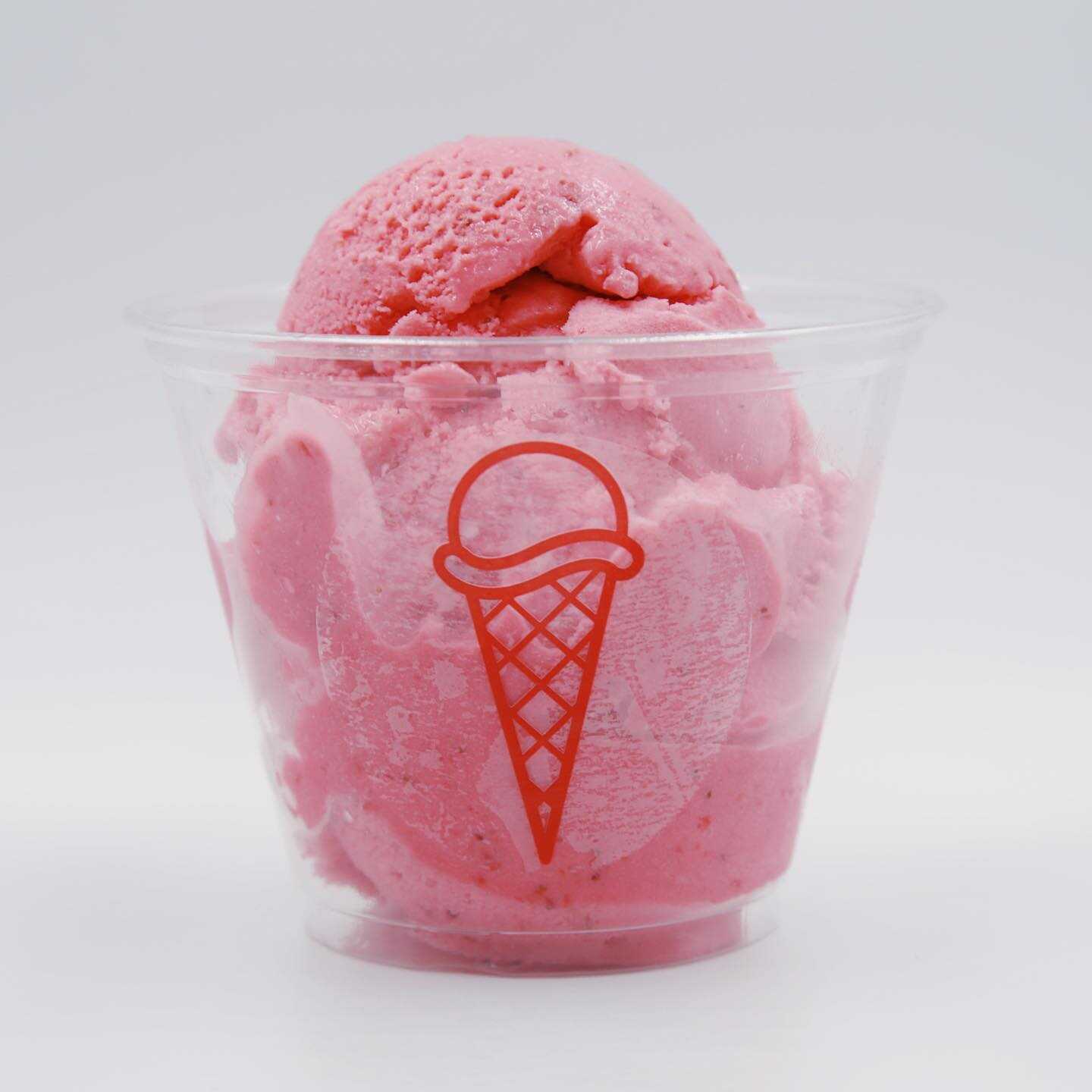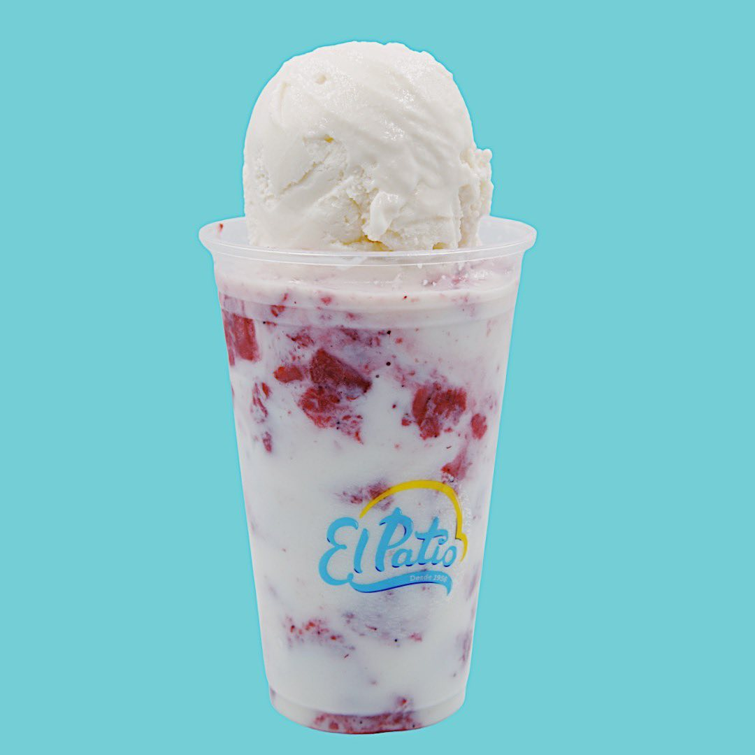 Leche vainilla con frutas, nieve de vainilla y mermelada.