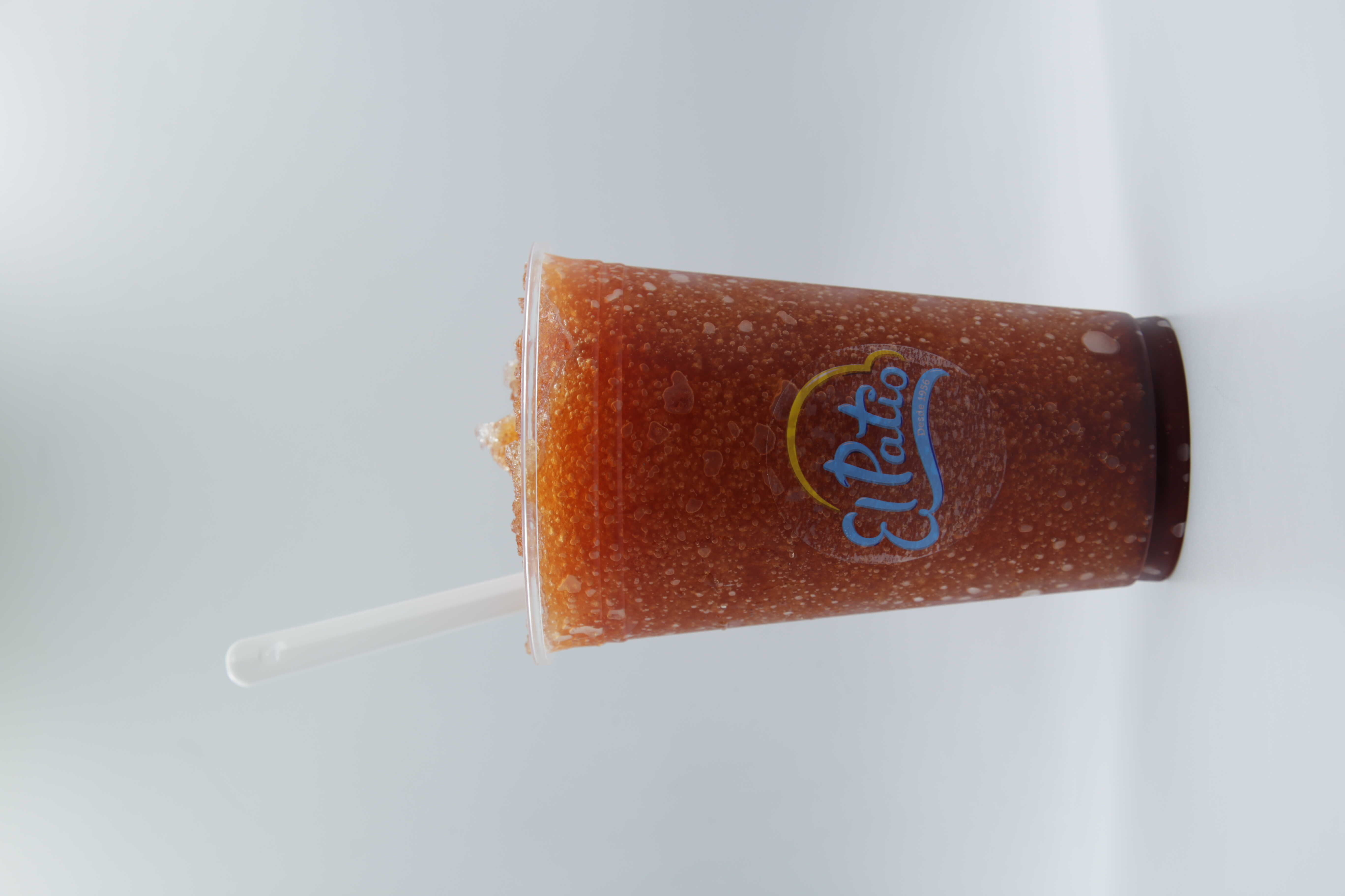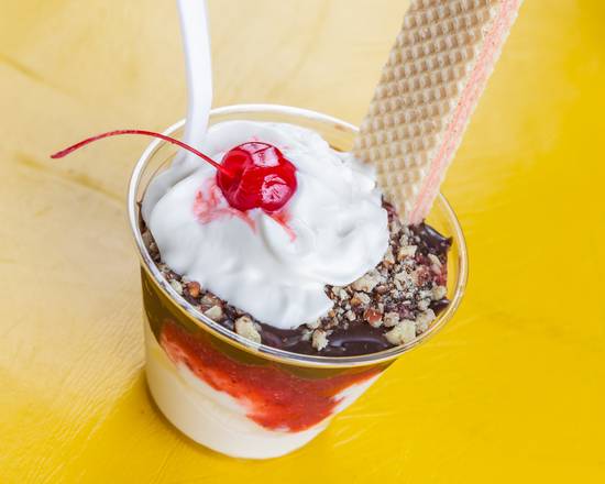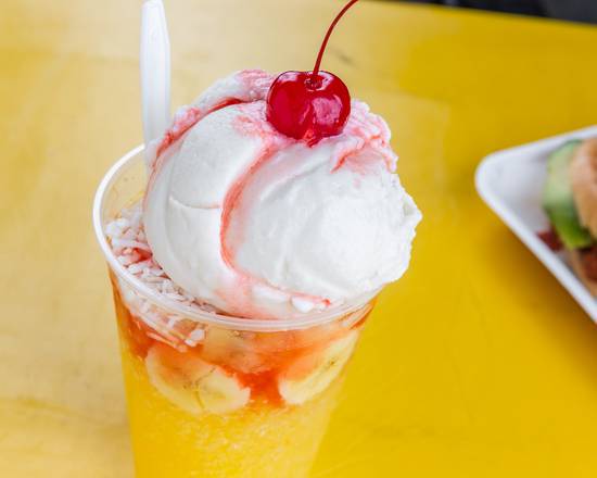Piña con plátano, trozos de piña, coco, nieve de vainilla y una cereza.