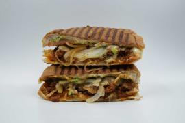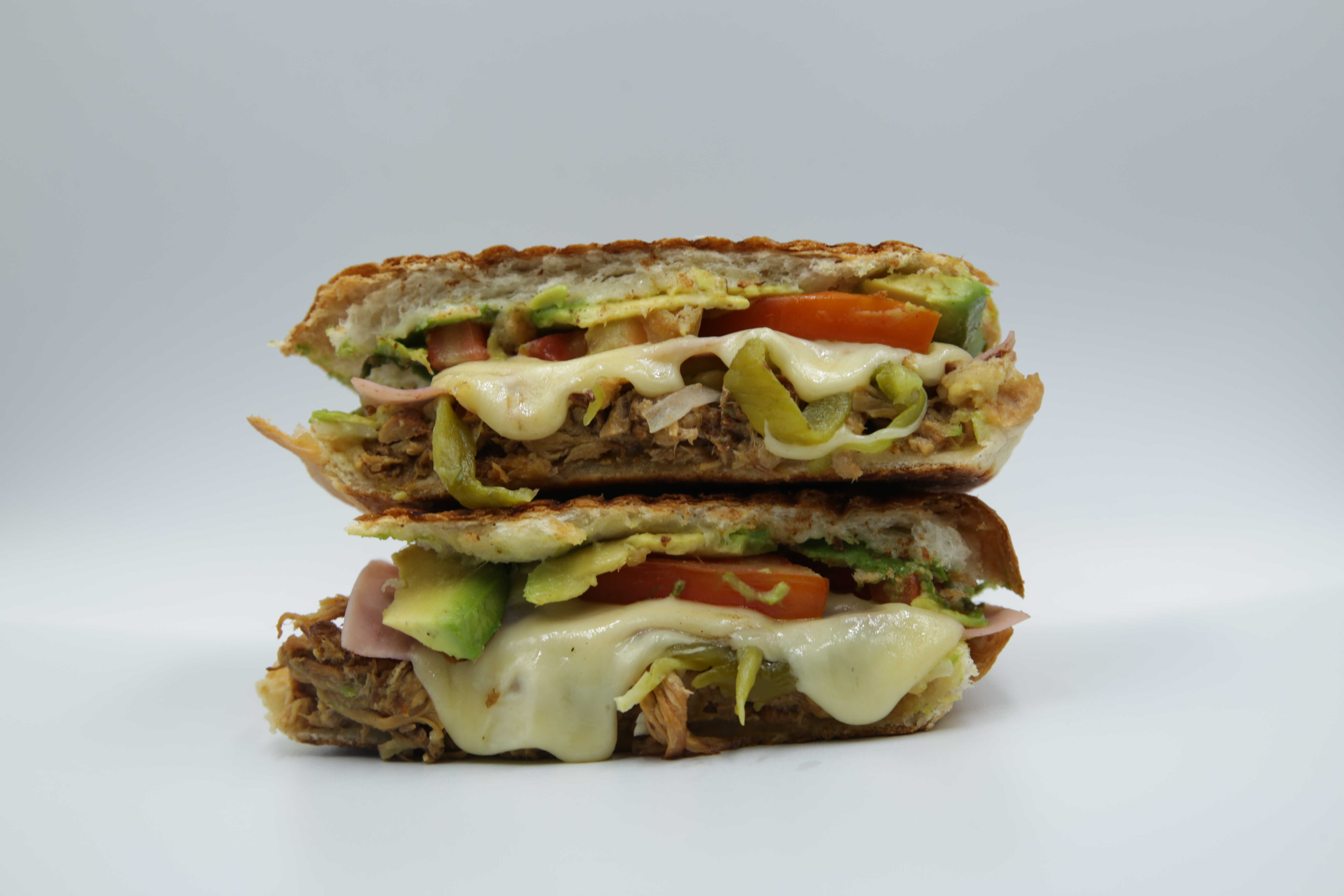 Pan telera, aguacate, tomate, cebollita asada, carne adobada y queso.