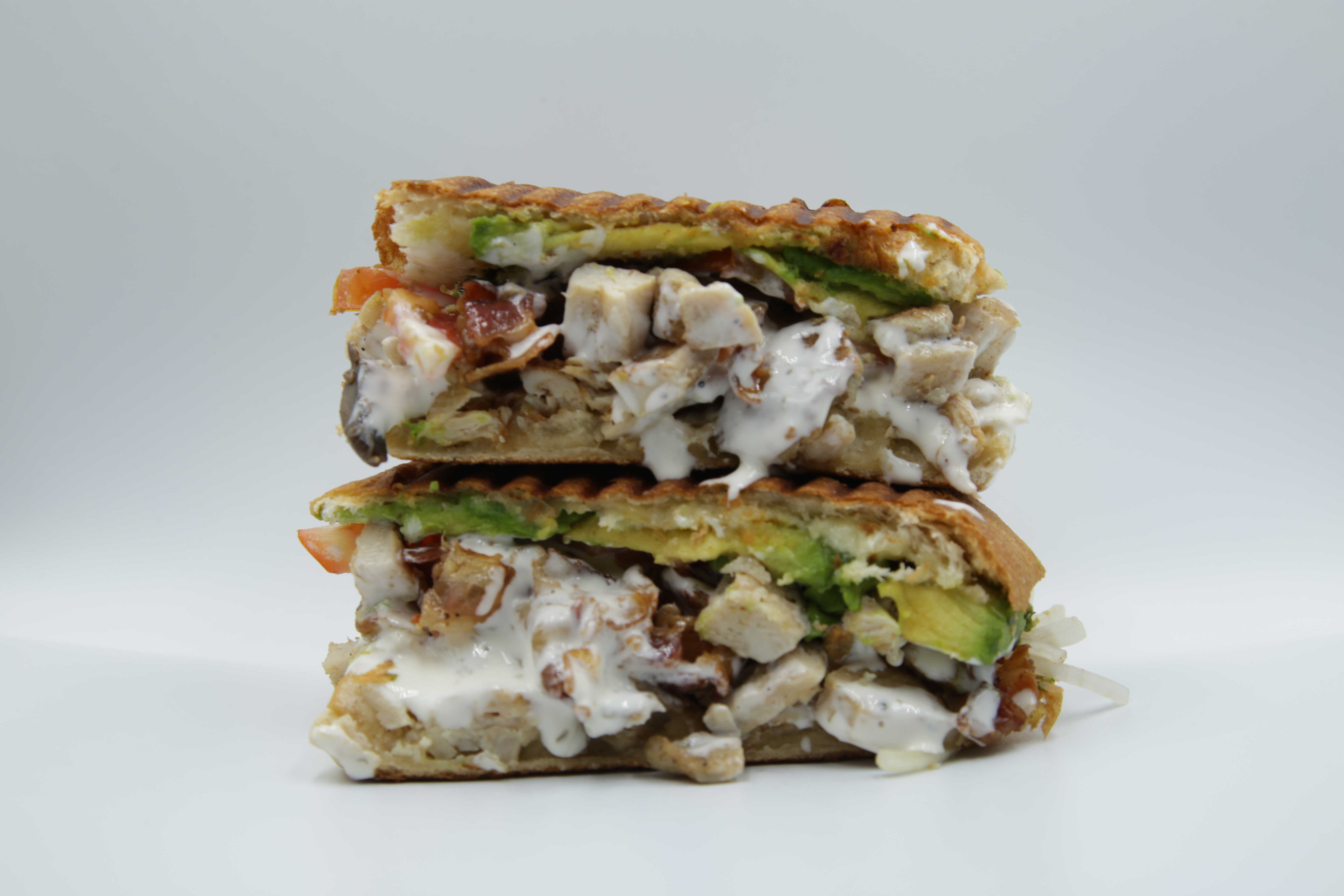 Pan telera, aguacate, tomate, cebolla, pollo tocino y ranch.
