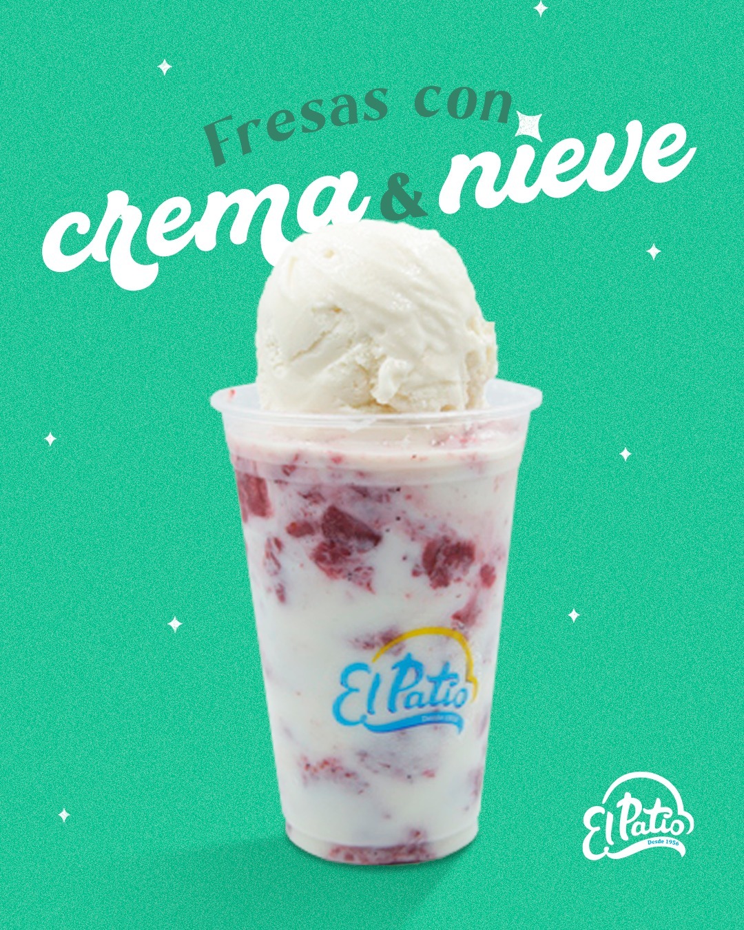 Leche vainilla con frutas, nieve de vainilla y mermelada.