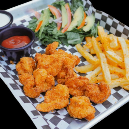 Crujientes y dorados, con sabor del mar en cada bocado, acompañados de ensalada de col y papas francesas.