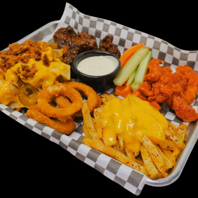 Alitas, boneless, dedos de queso, aros de cebolla, nachos con chilibean y papas a la francesa.